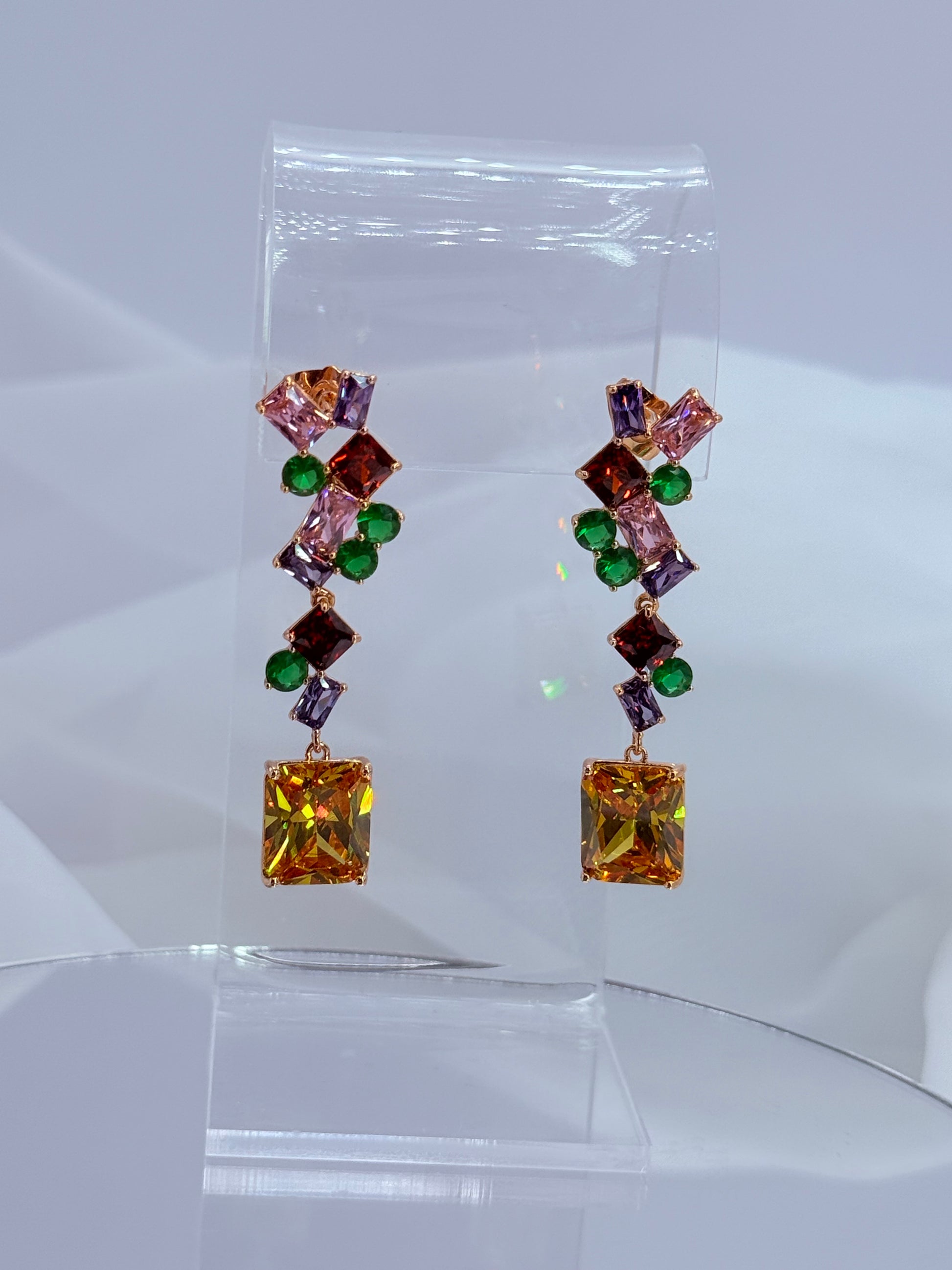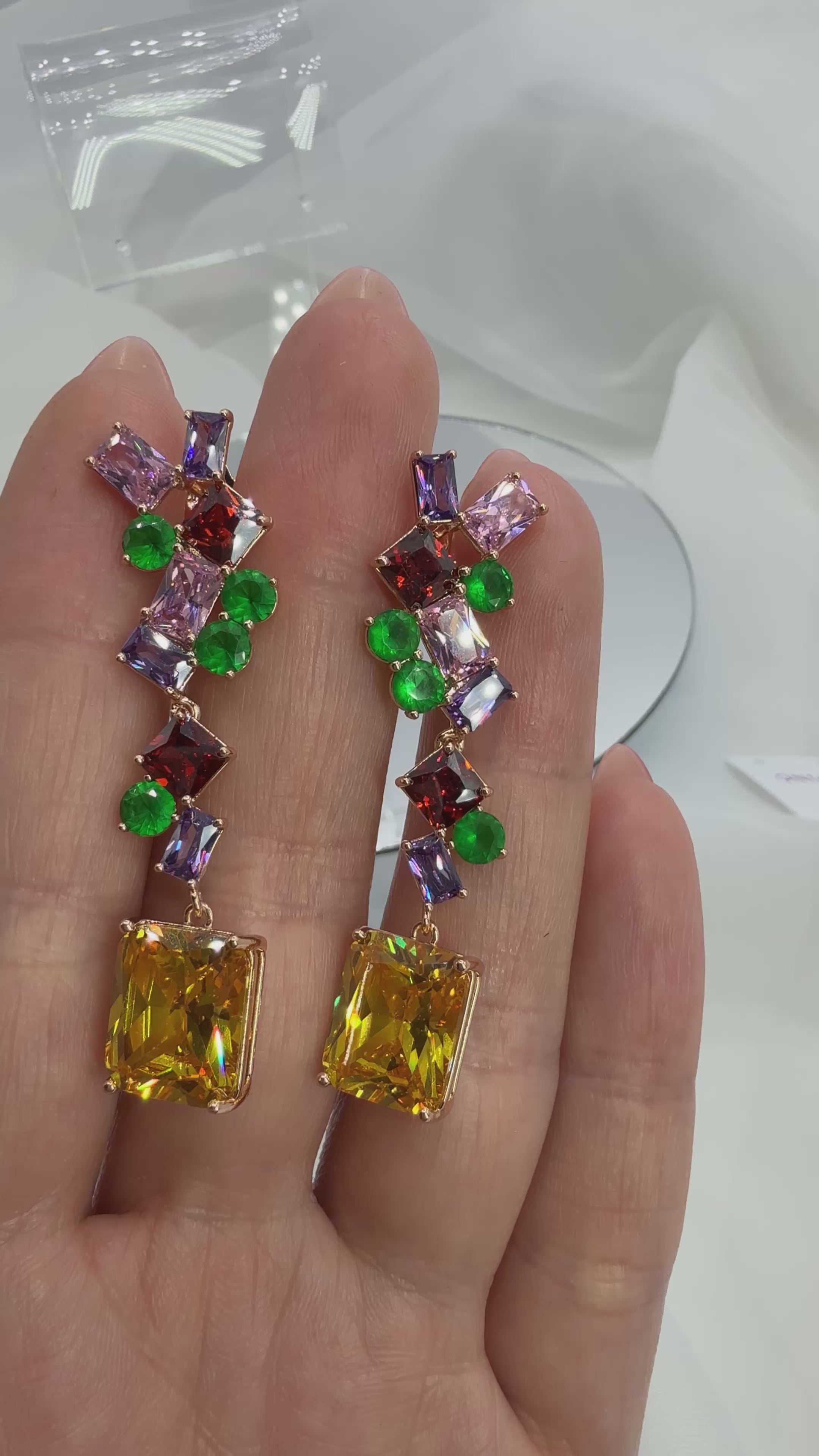 Atrévete a brillar con nuestros impactantes Aros Technicolors. Diseño statement que celebra la vida en todo su esplendor cromático, con cristales checoslovacos en amarillo dorado, rosa, lila, verde esmeralda y rojo granate. Una cascada de color y luz elaborada artesanalmente con baño de oro 18K. Perfectos para la mujer audaz que no teme destacar y celebra su personalidad vibrante.