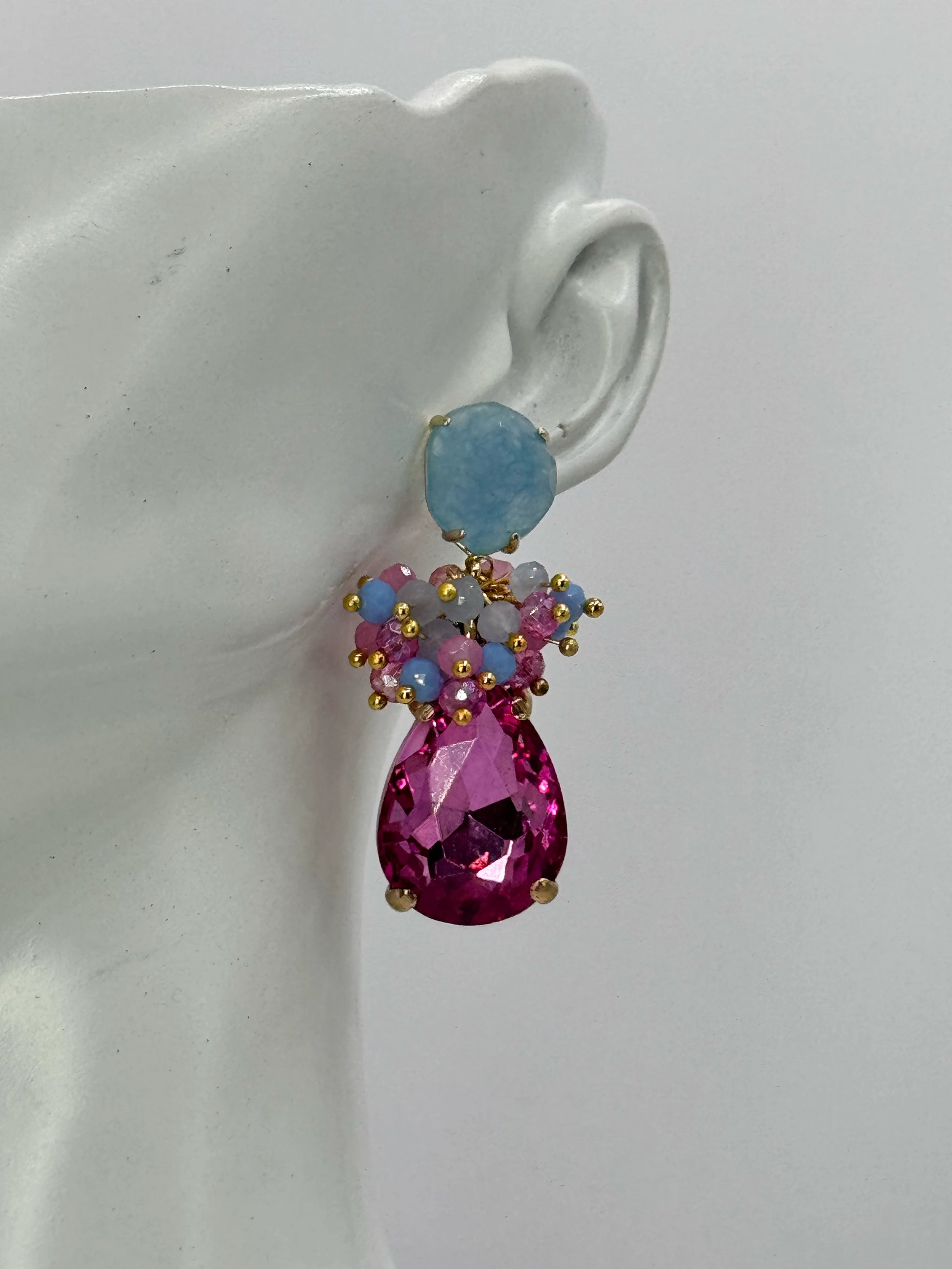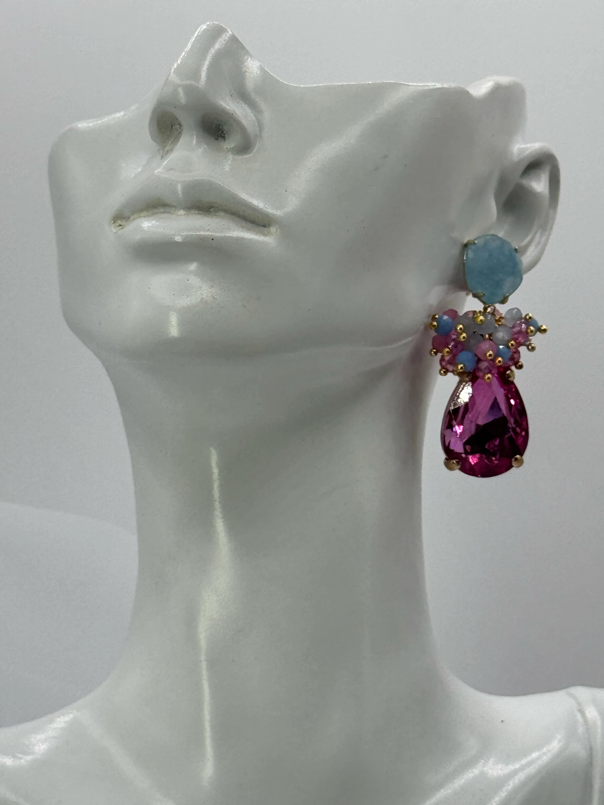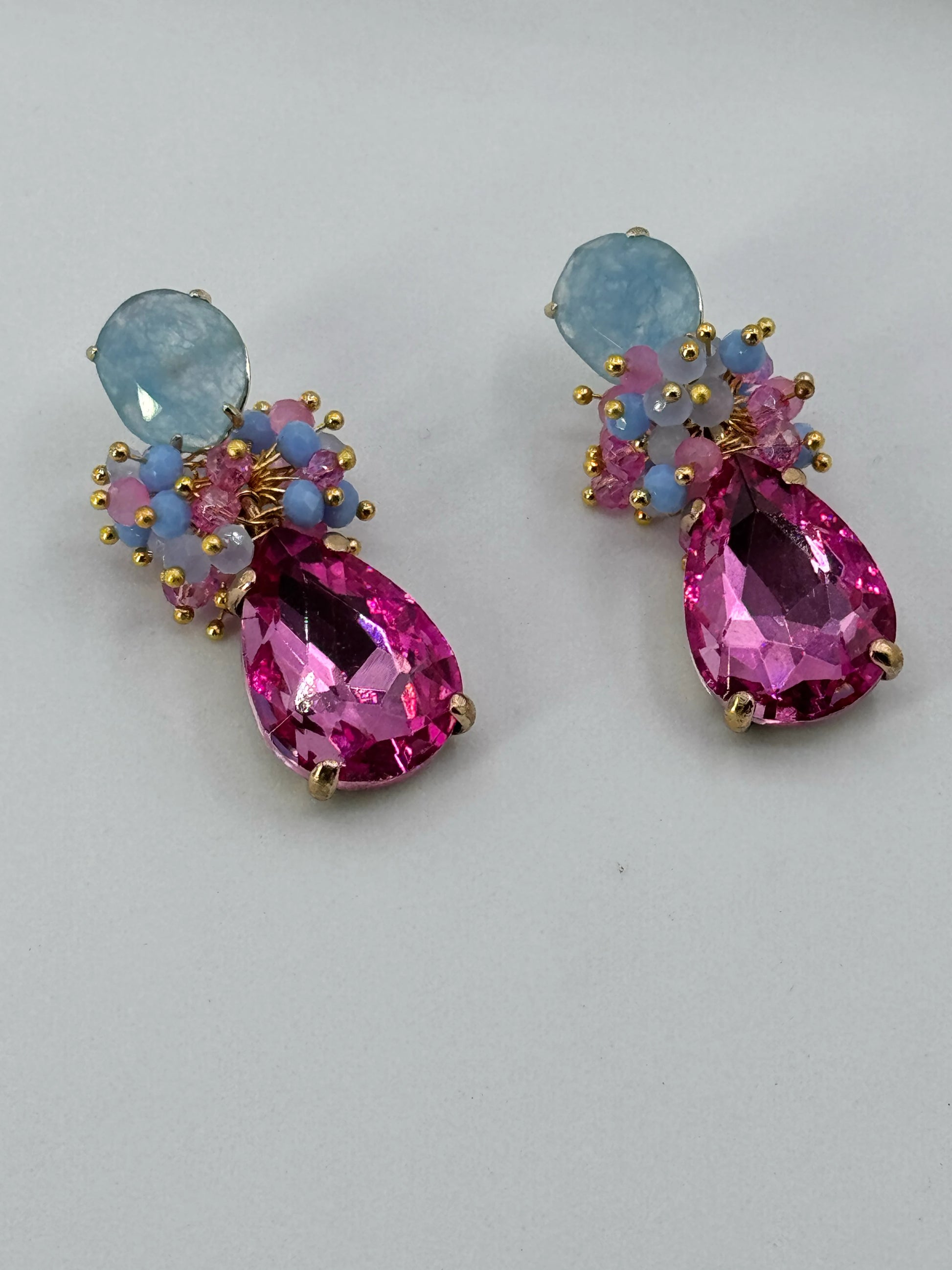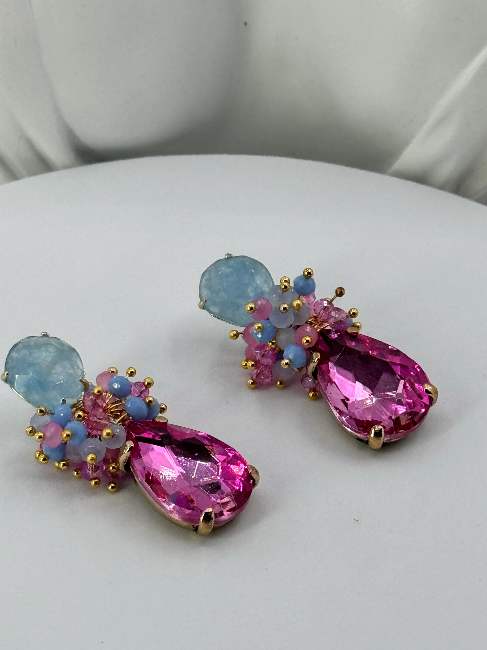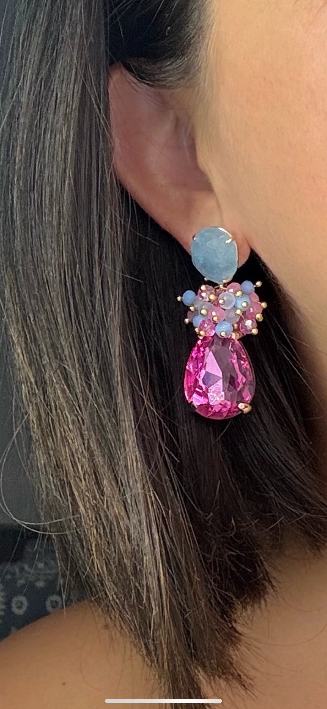 Los Aros Bora Bora – Bay Pink celebran la fusión perfecta entre color, brillo y frescura. Su diseño combina una gota de cristal rosado intenso con un racimo de piedras en tonos pastel —rosas, celestes y lavanda—, evocando el atardecer sobre una bahía tropical.