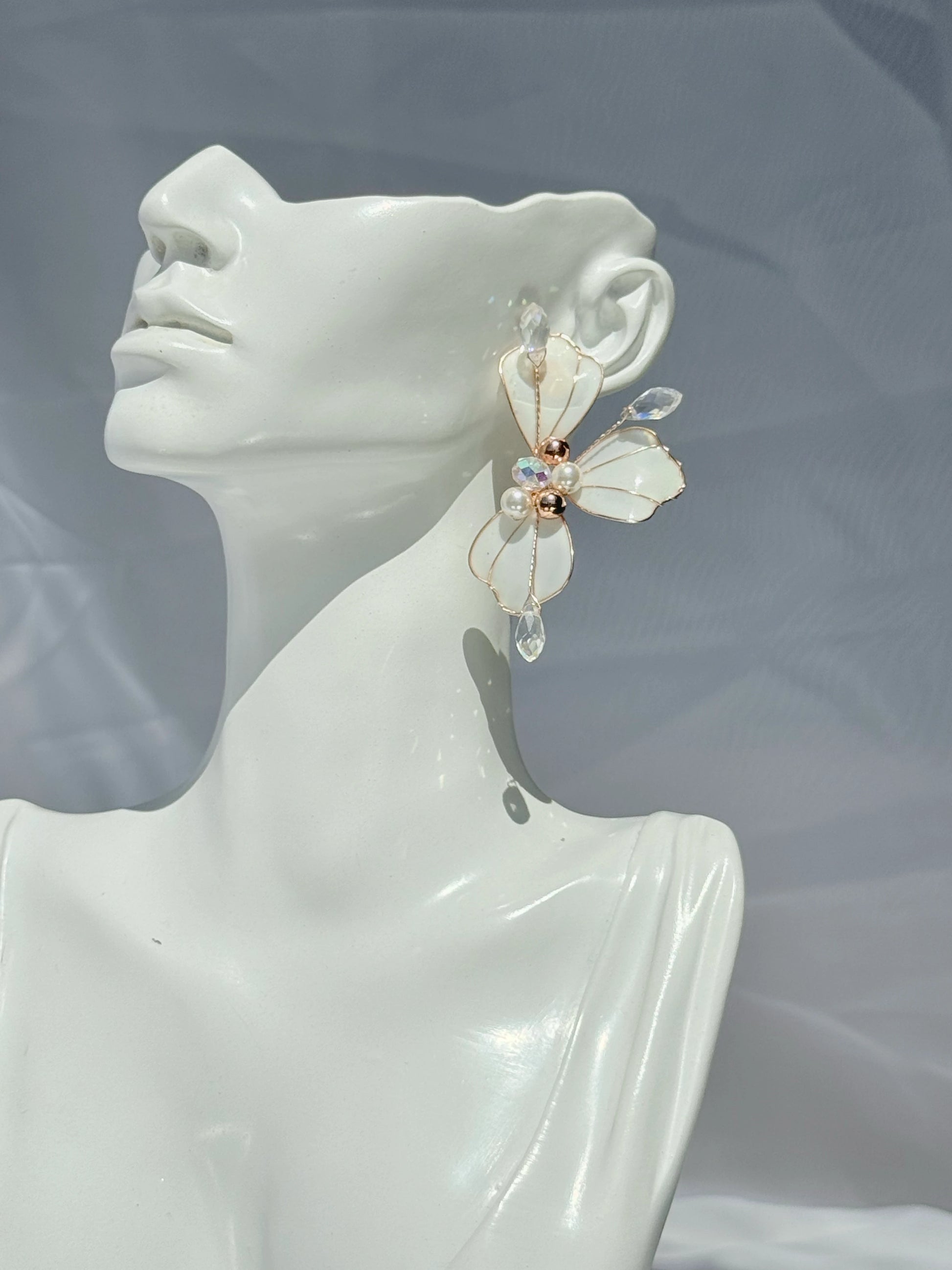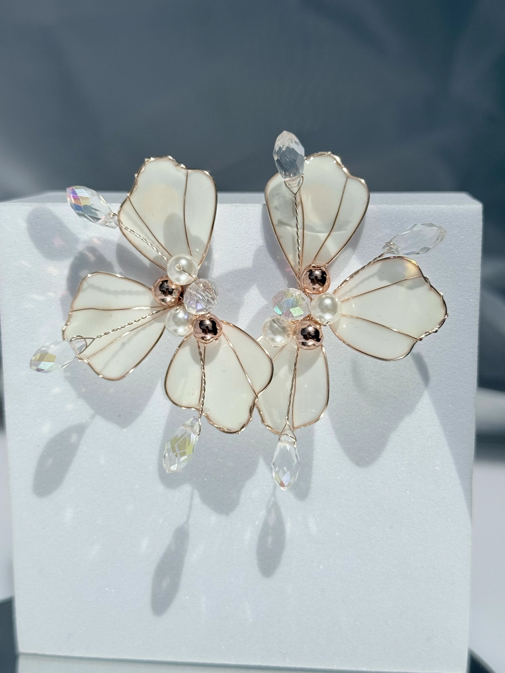 • Detalles: cristales austriacos, perlas de agua dulce y pétalos en resina blanca mate translúcida.