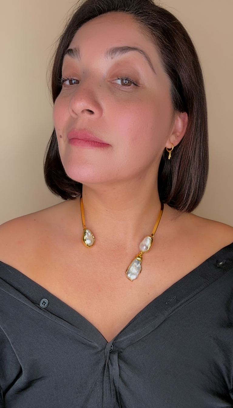 Torque rígido en oro brillante con acabado pulido que rodea el cuello creando una base estructurada y moderna. En cada extremo del collar, una perla barroca en forma de gota está engarzada en marco dorado, creando balance visual. Del centro frontal cuelga la pieza protagonista: primero una perla barroca mediana, seguida de una perla barroca más grande y dramática con forma irregular orgánica, ambas con iridiscencias naturales que reflejan tonos rosados, azules y plateados según la luz. El contraste entre la estructura rígida del torque y las formas fluidas y orgánicas de las perlas crea un efecto visual sofisticado y avant-garde. Es ese collar que usas cuando quieres hacer una entrada memorable.