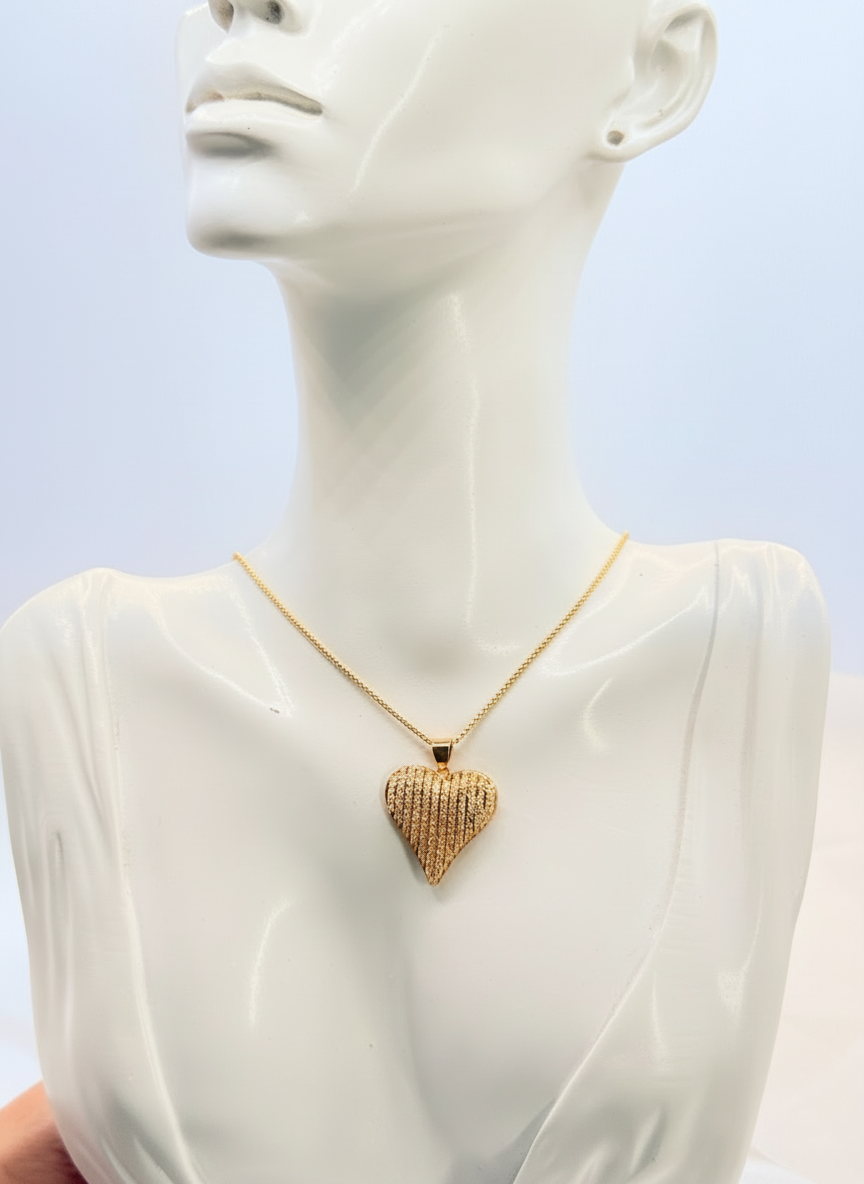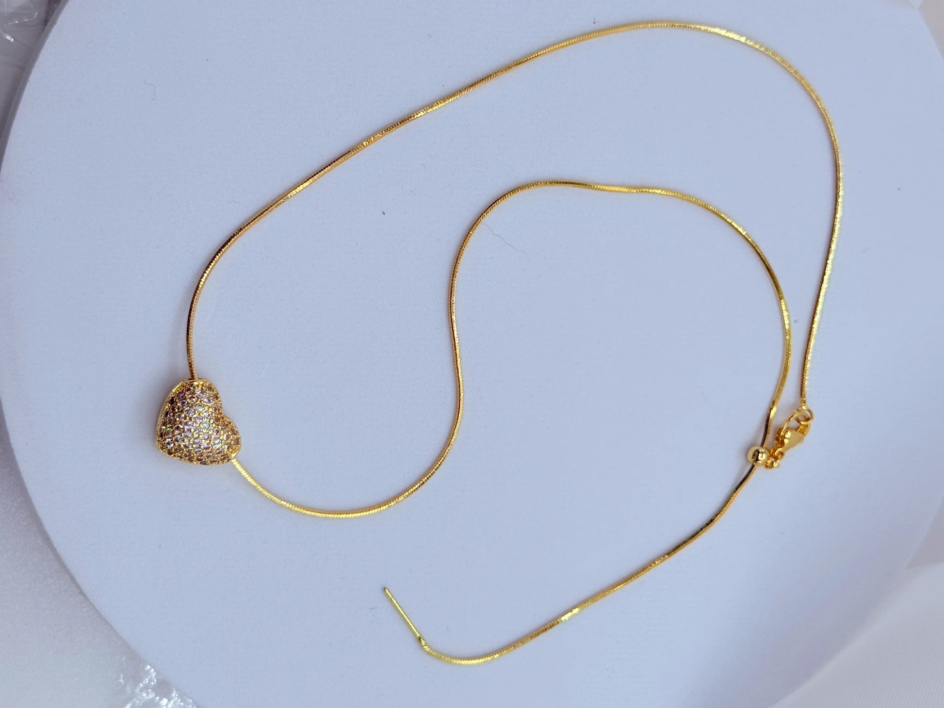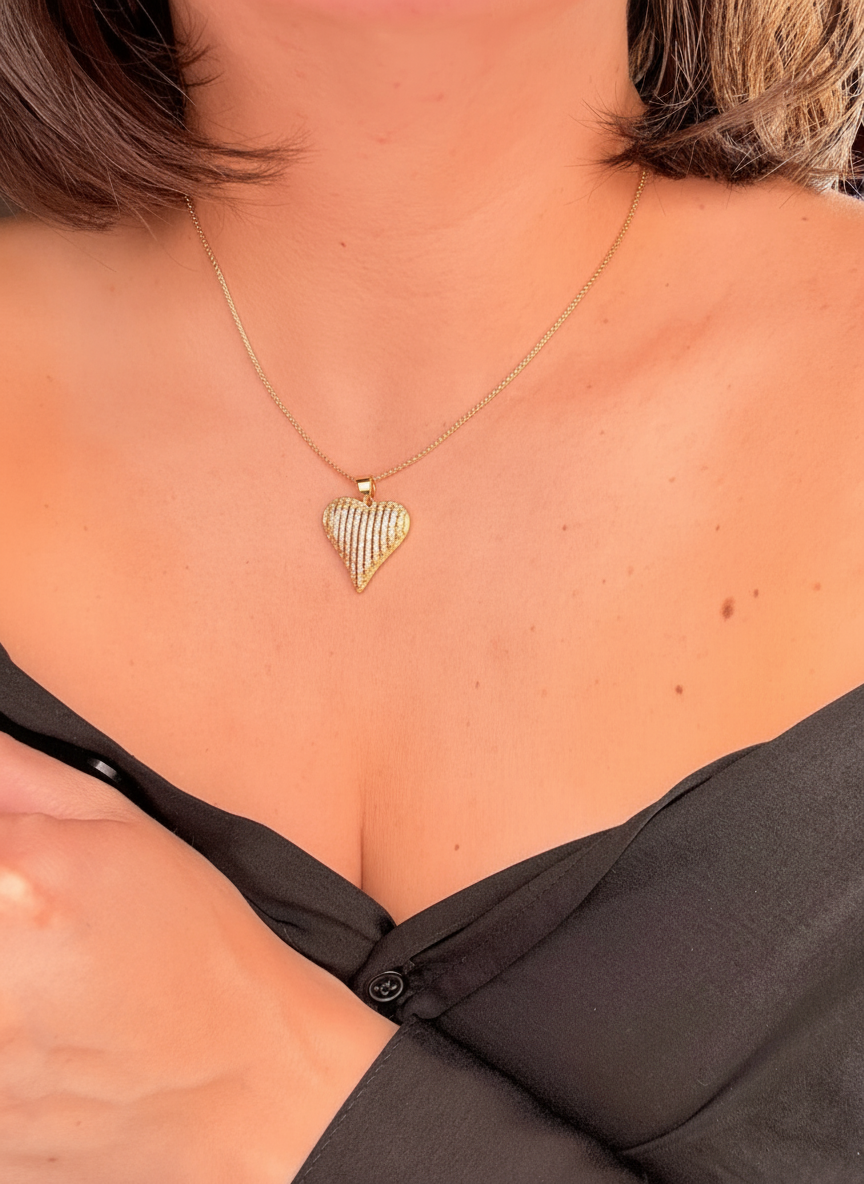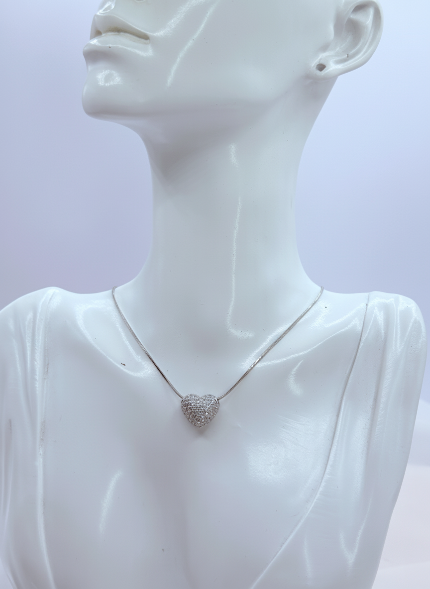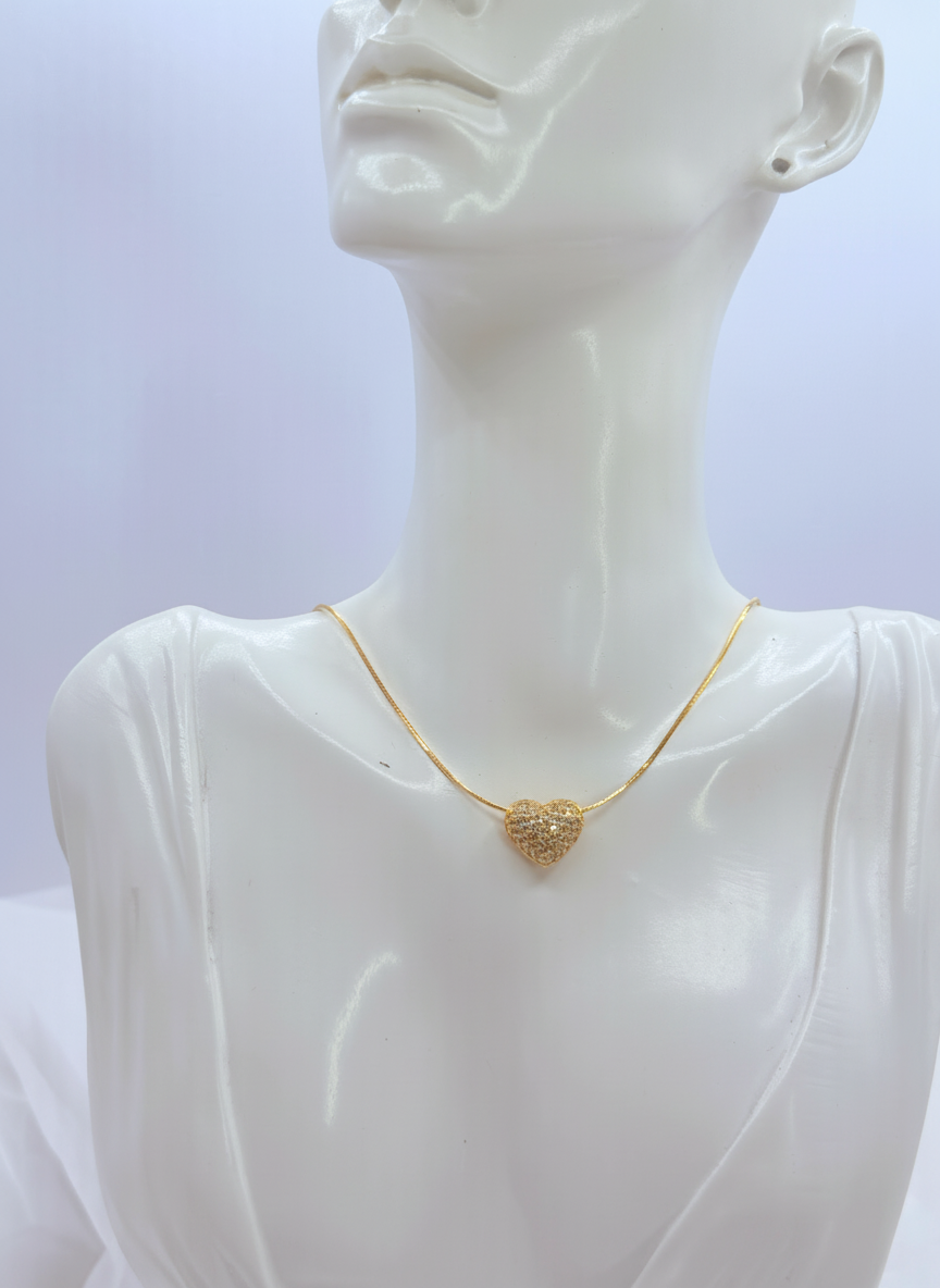 Cadena tipo snake ultrafina que crea una línea continua y brillante alrededor del cuello, tan delicada que casi parece un hilo de luz. El corazón tridimensional está completamente pavimentado con circonitas en engaste micro-pavé, creando una superficie brillante sin interrupciones. El dije se desliza libremente por la cadena, permitiéndote centrarlo perfectamente o dejarlo caer de forma natural hacia un lado. Es ese collar que te pones en la mañana y olvidas que llevas, pero que cada vez que te miras al espejo te hace sonreír. El tamaño del corazón es perfecto: suficientemente visible para ser adorable pero lo suficientemente discreto para uso diario.