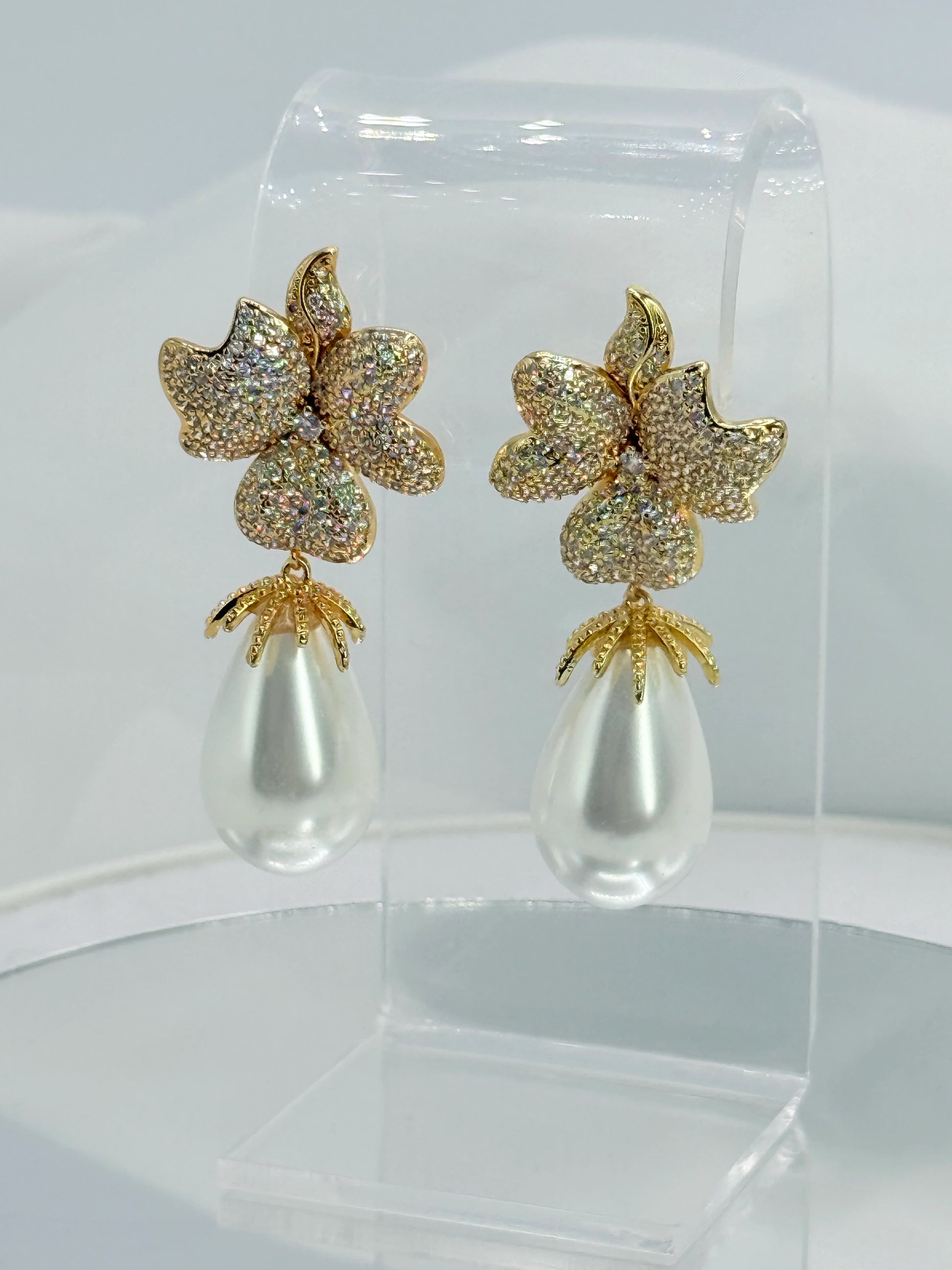 Estos aros florales destacan por su diseño elegante y atemporal, donde una flor dorada con circones se combina con una perla blanca en forma de gota, creando una joya sofisticada y femenina que realza el rostro con delicadeza.