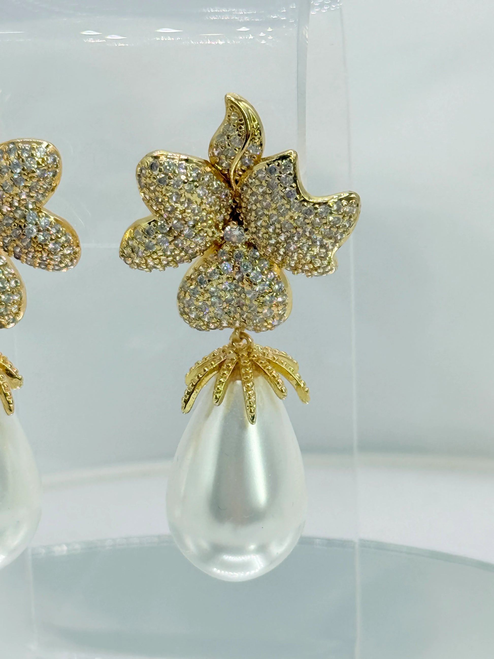 La flor, trabajada con circones que capturan la luz, aporta brillo y textura, mientras que la perla colgante añade movimiento y un aire clásico refinado. Son aros equilibrados, luminosos y perfectos para ocasiones especiales donde el detalle marca la diferencia.