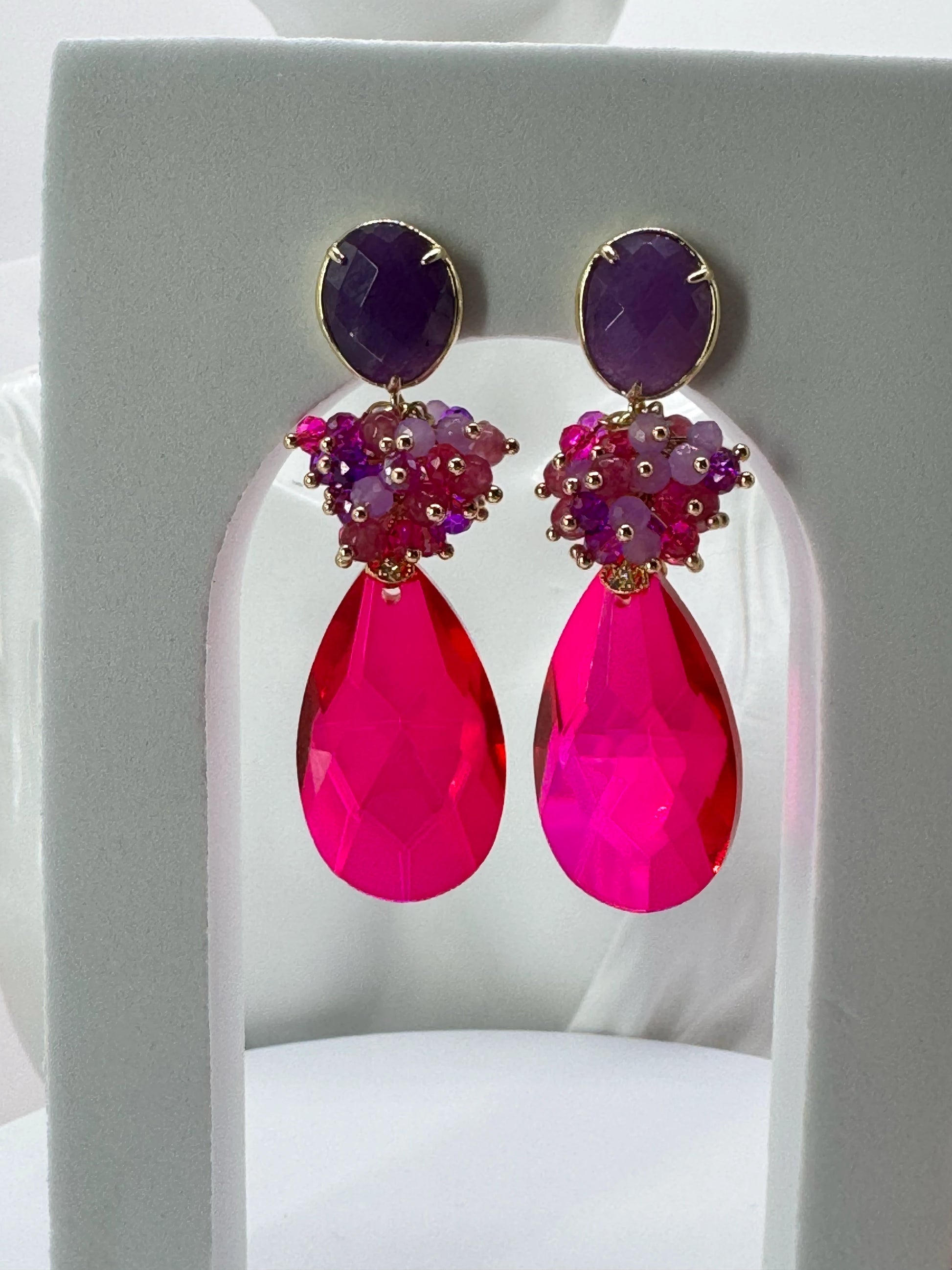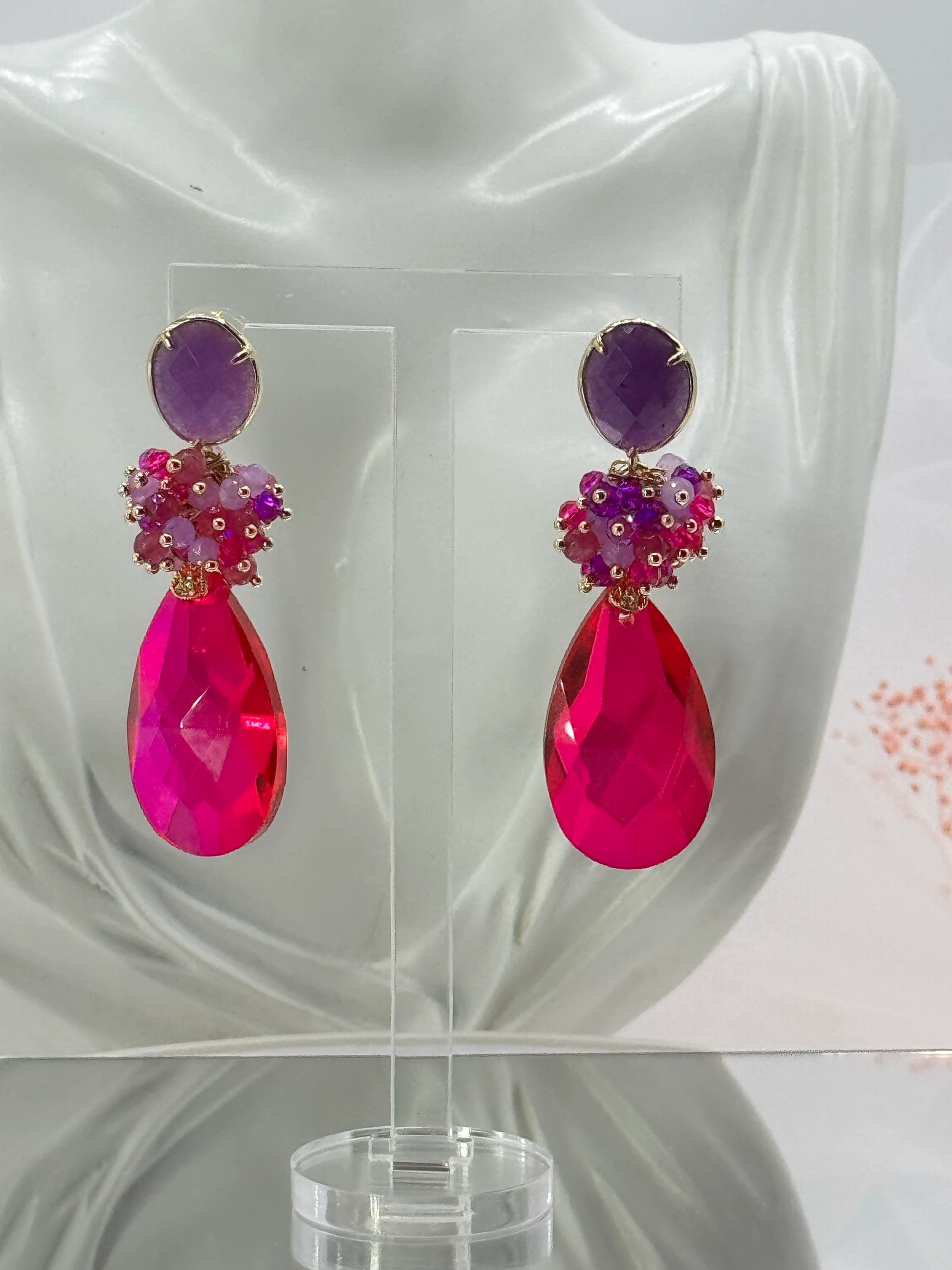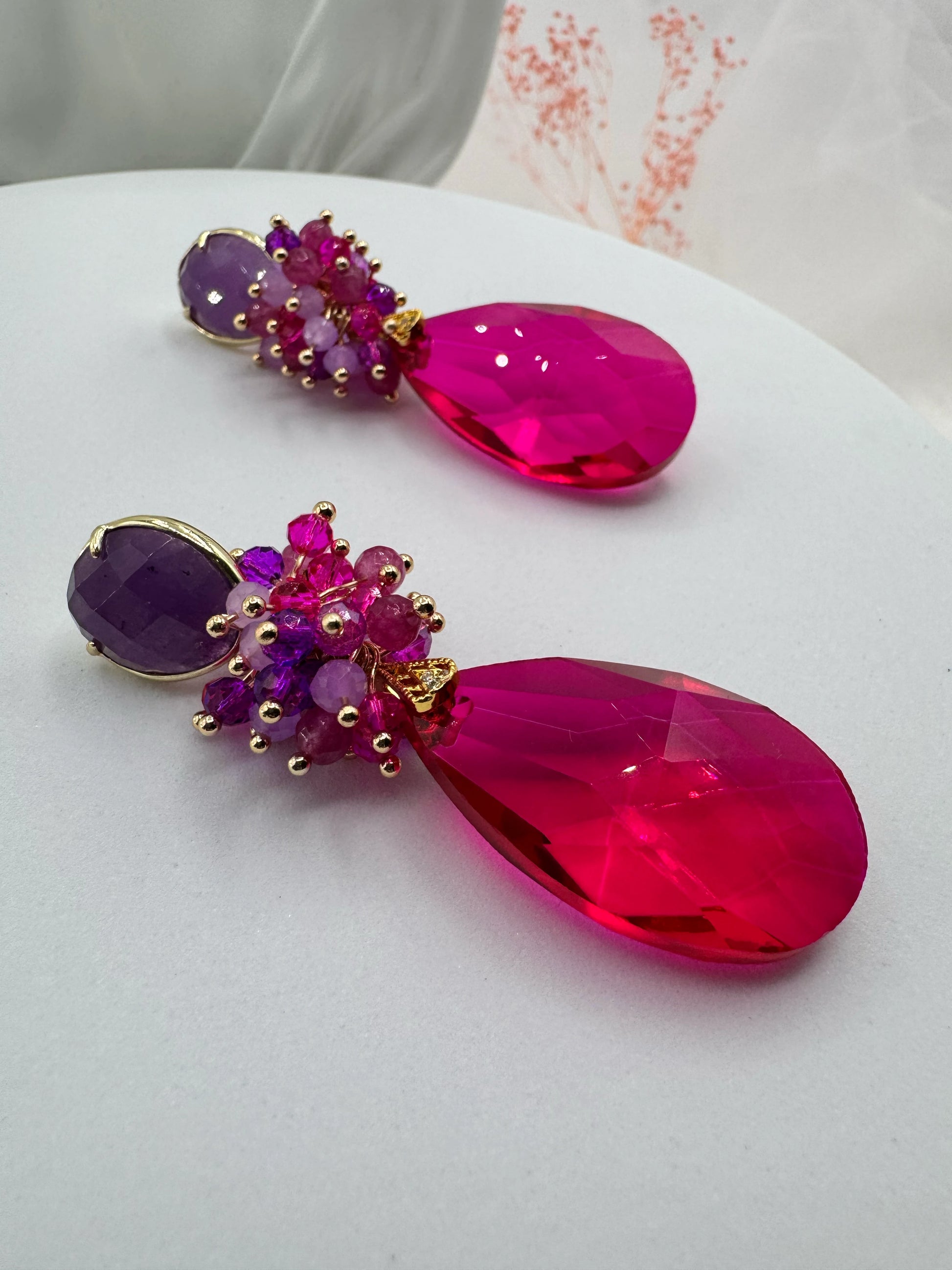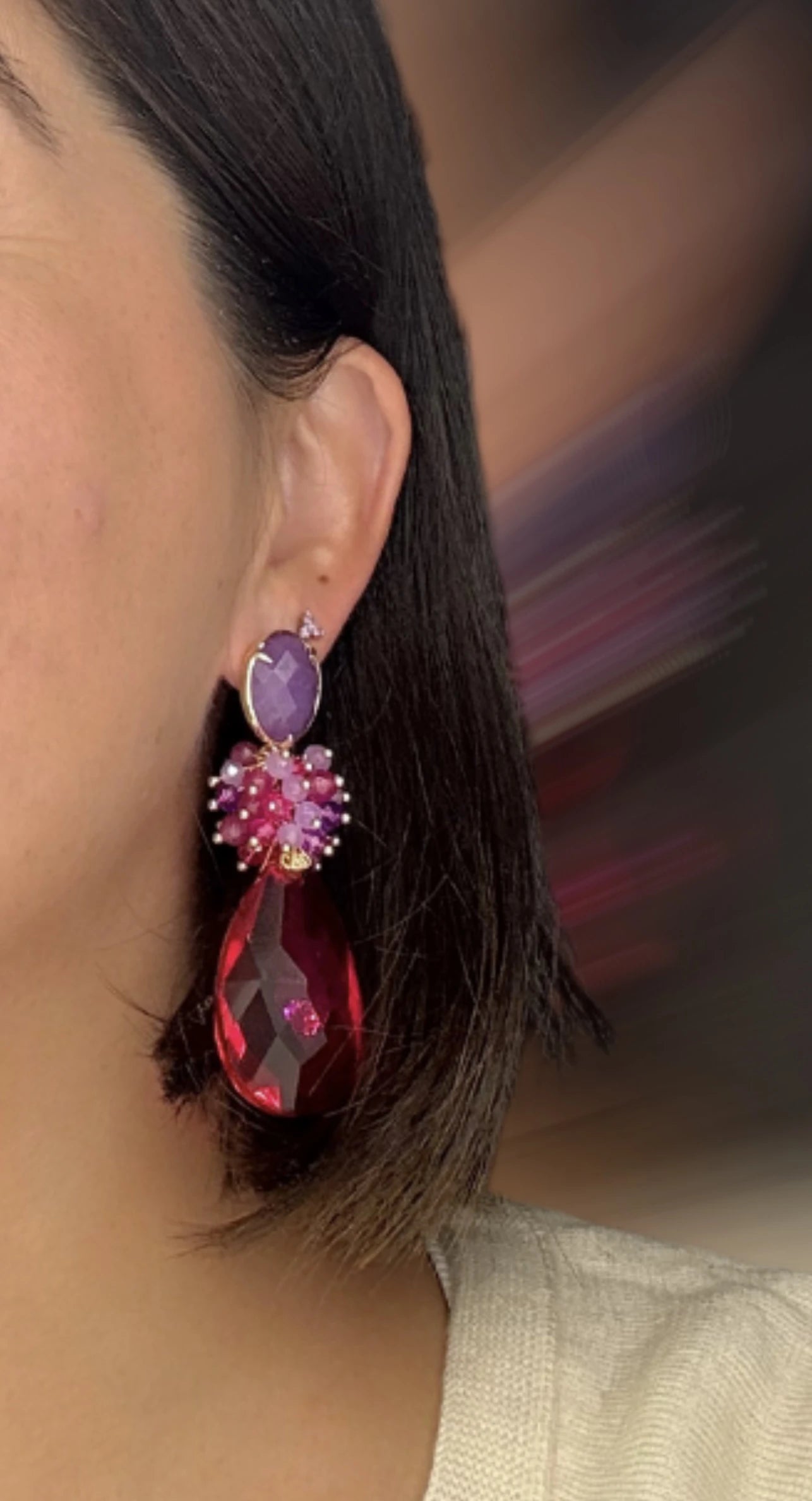 Los Aros Bora Bora – Fuchsia Sunset irradian pasión y sofisticación con su fusión de tonos fucsia y violeta. Su diseño combina una gota de cristal rosa intenso con un racimo de piedras en matices púrpura, magenta y rosado, creando un juego de luces que recuerda los atardeceres sobre el mar.
