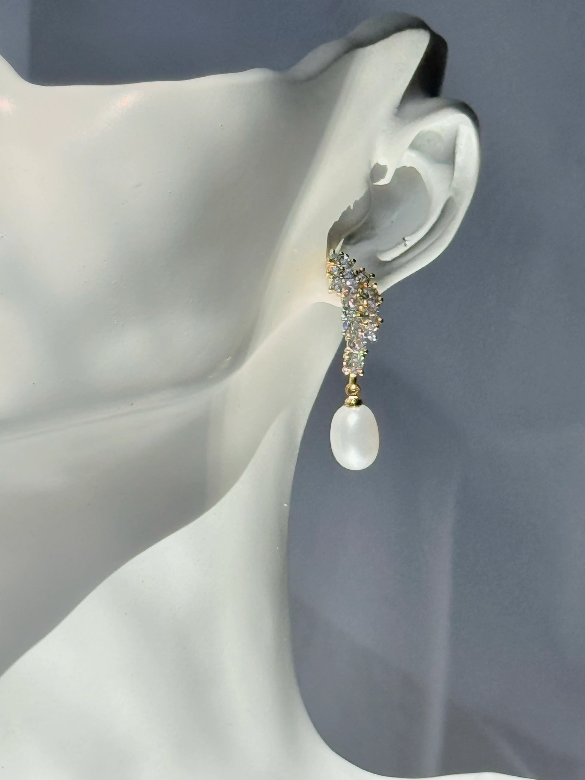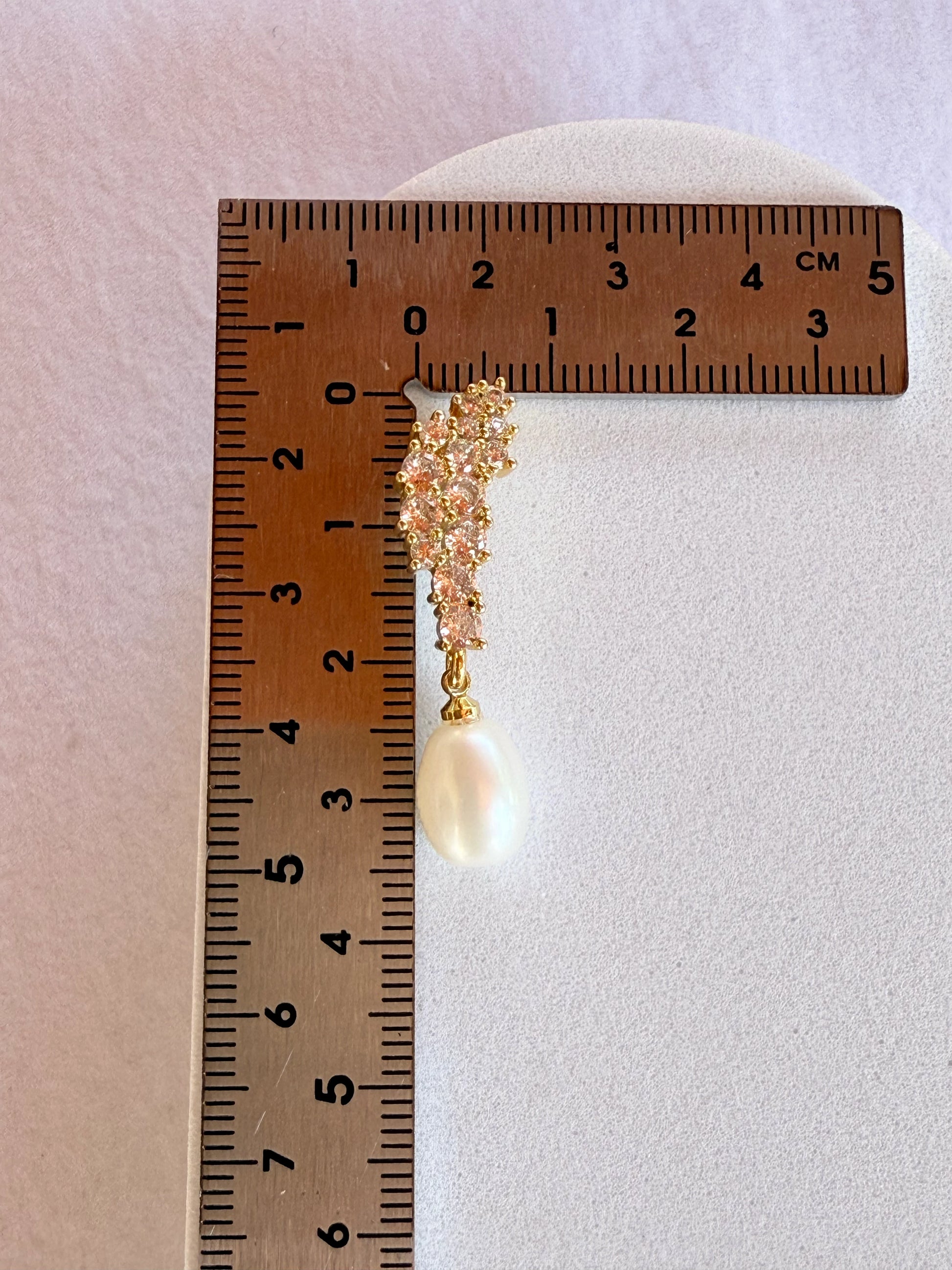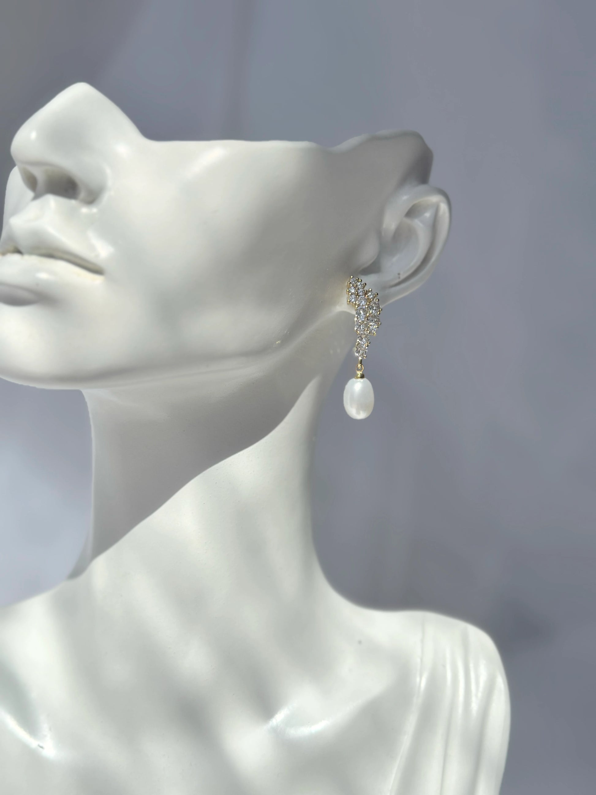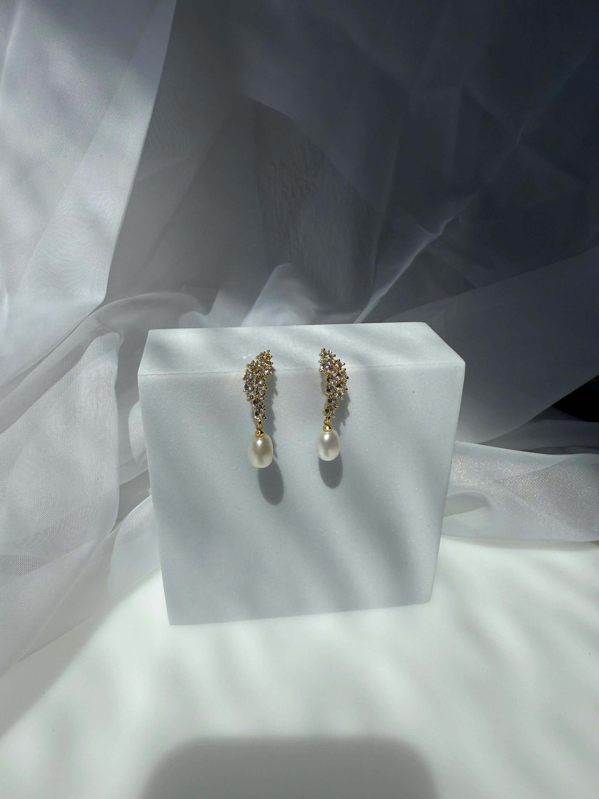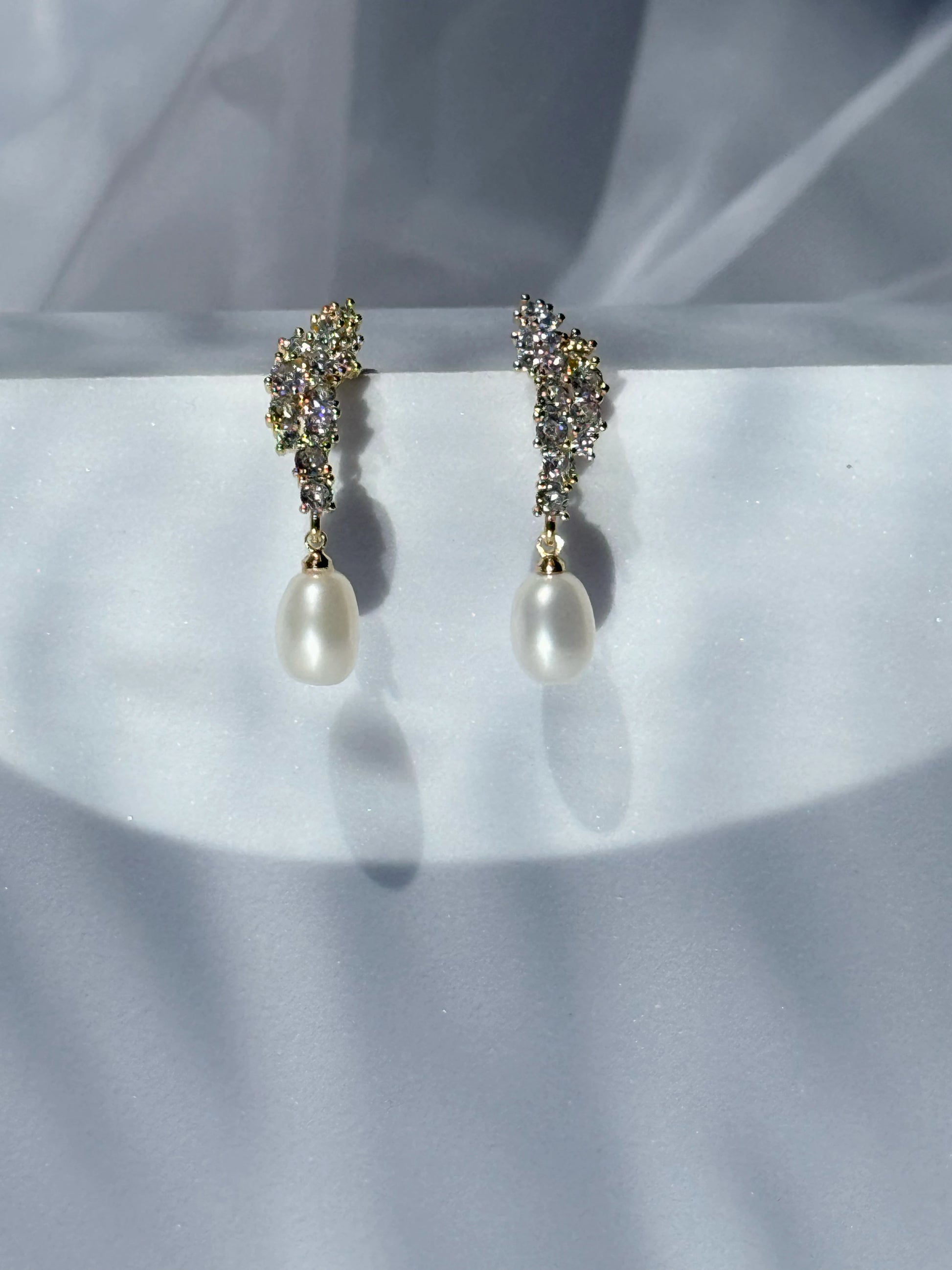 Los Aros Aurora son una joya que equilibra el glamour contemporáneo con la delicadeza clásica. Su base en enchape de oro 18k, finamente adornada con circonitas engastadas en diseño orgánico y asimétrico, se complementa con una perla natural colgante, creando un contraste perfecto entre luz, textura y movimiento.