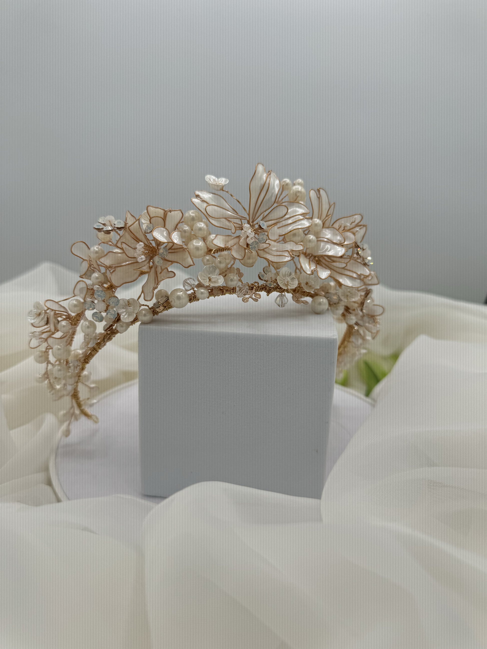Cada pétalo ha sido modelado a mano con finos hilos dorados y delicadas flores translúcidas que evocan el brillo del nácar. Su estructura, enriquecida con perlas naturales de agua dulce y cristales facetados, crea una composición armoniosa que ilumina el rostro con sutileza.