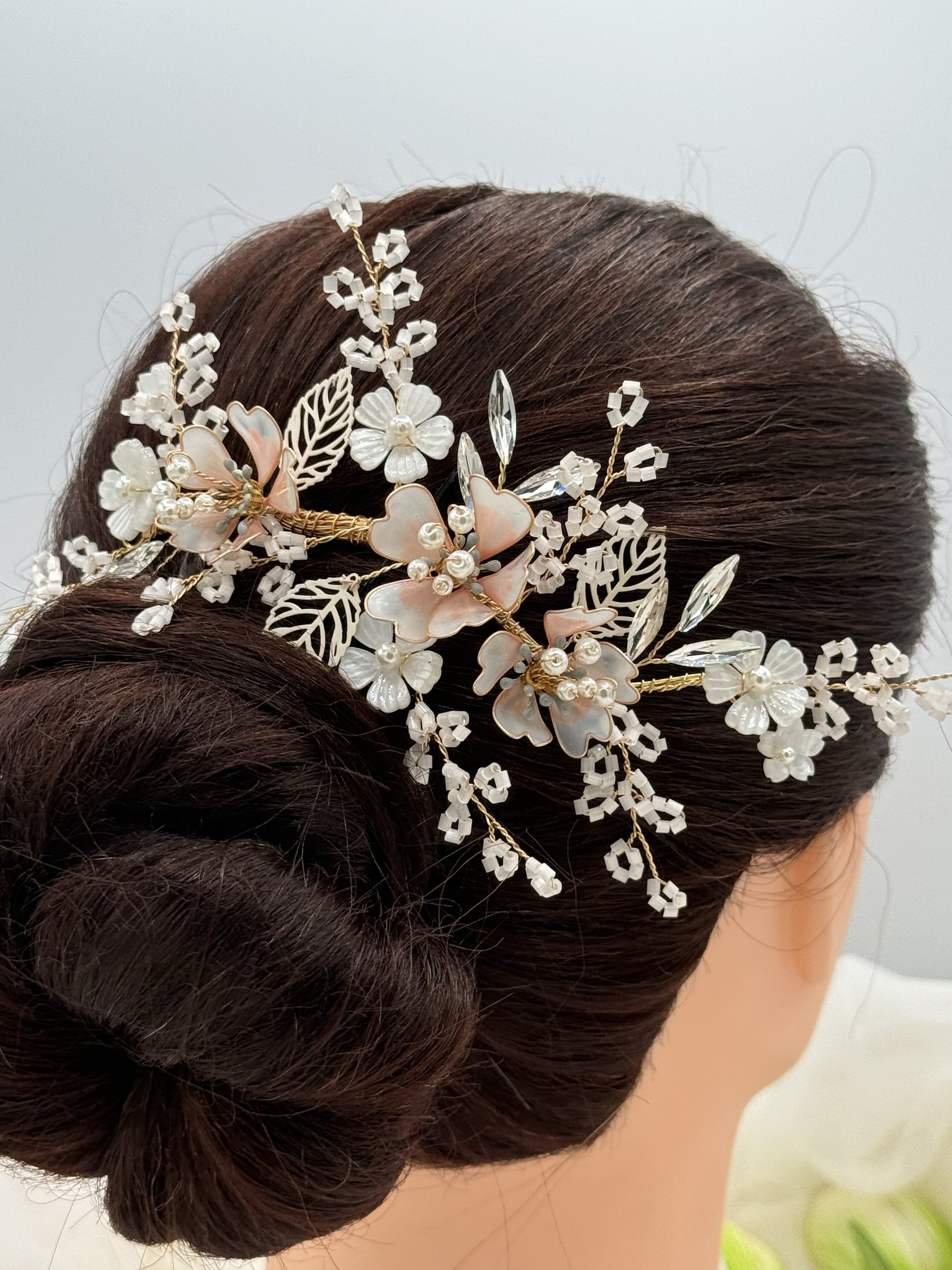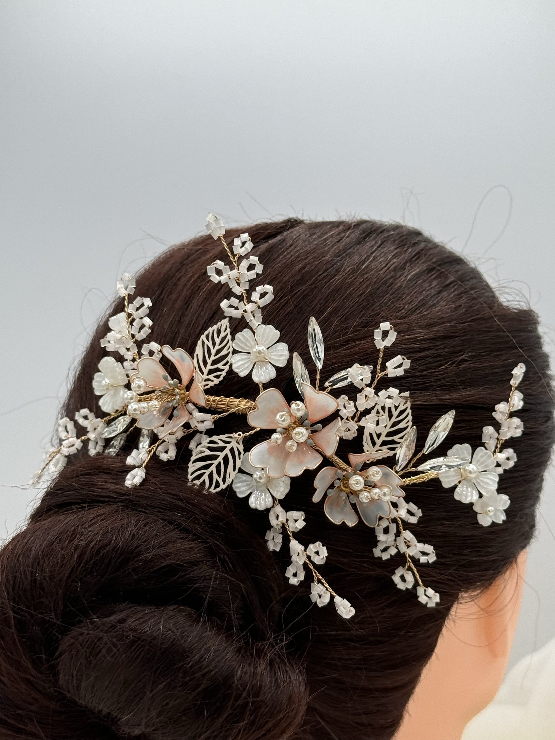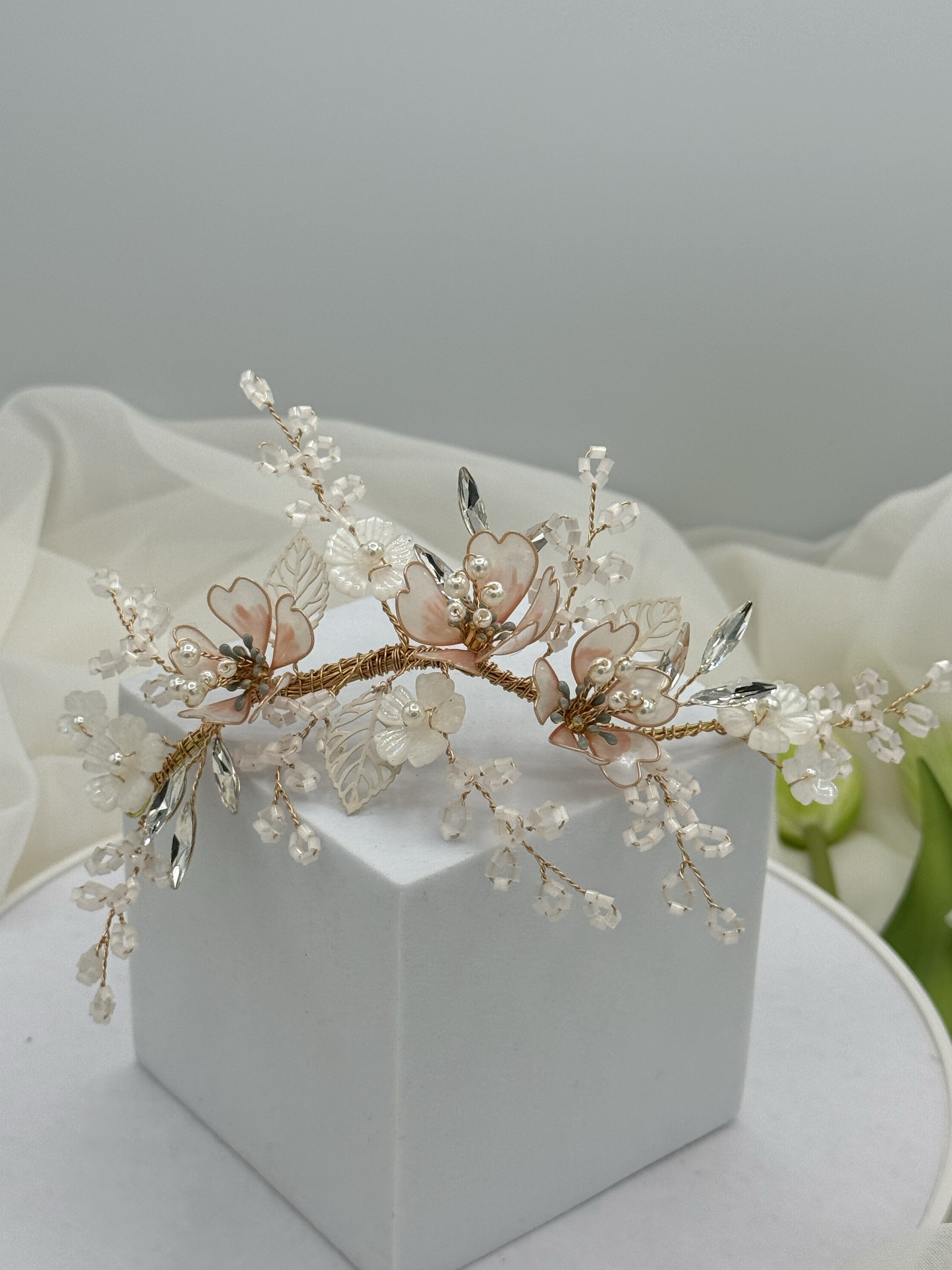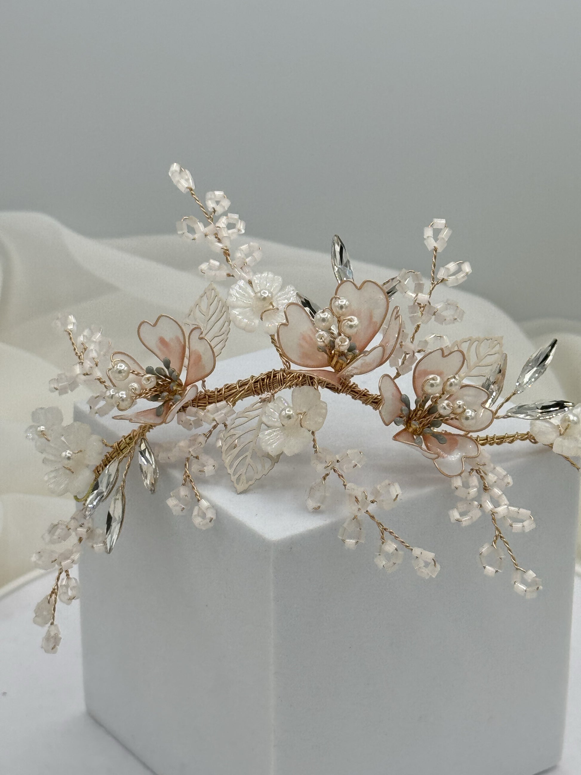Inspirado en los primeros brotes de la primavera, combina flores de cristal en tonos blush y marfil, finas hojas metálicas doradas y sutiles perlas naturales, creando una pieza que irradia luz, suavidad y feminidad.