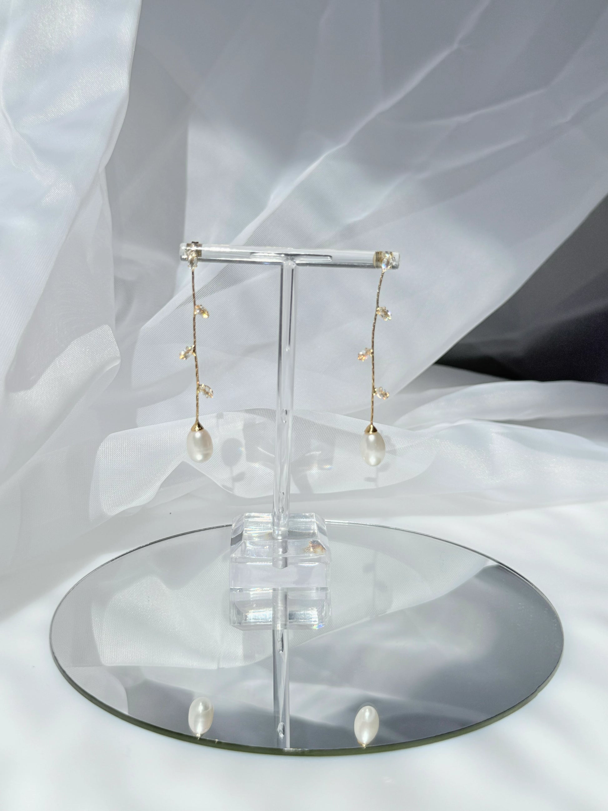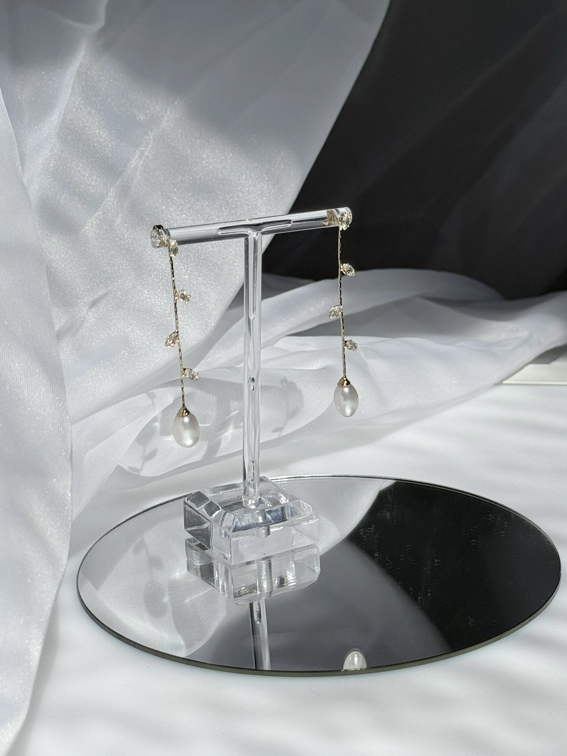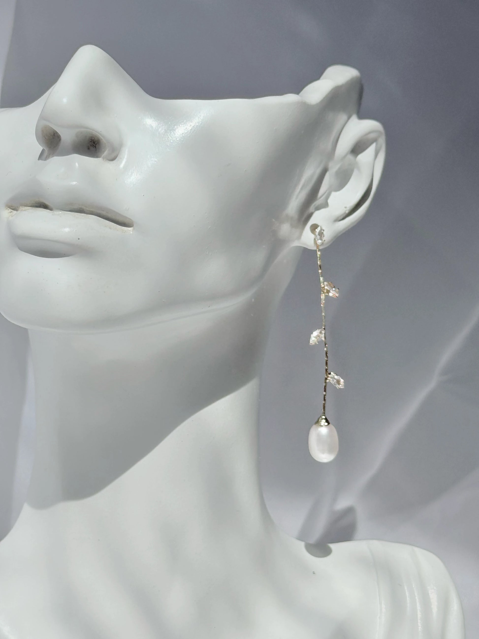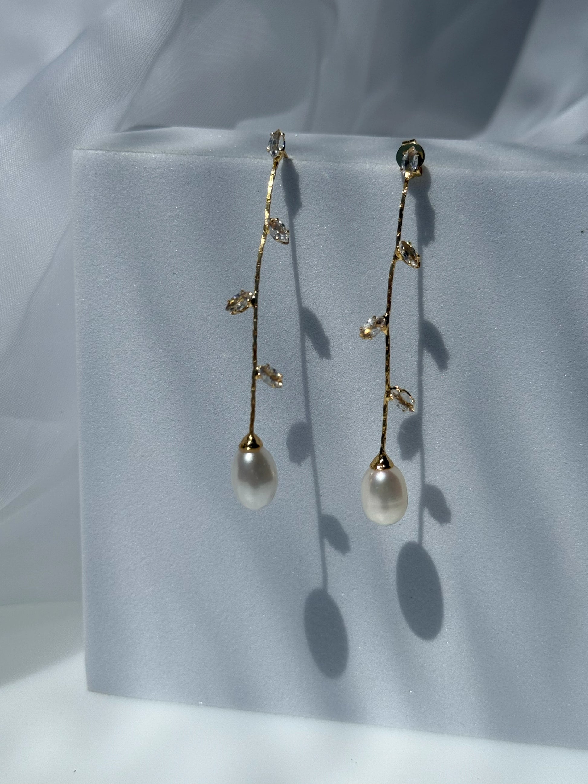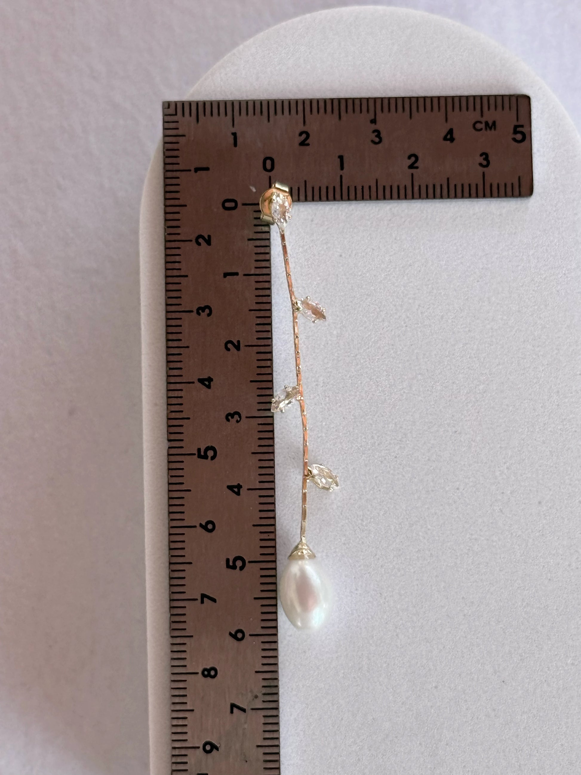 Los Aros de Perla - Leaf Drop son una joya de inspiración orgánica que combina la sutileza del oro con la luminosidad de los circones y el encanto atemporal de la perla natural. Su estructura alargada, con delicadas hojas engastadas en circones cúbicos, crea un efecto visual liviano y sofisticado que estiliza el rostro y aporta movimiento a cada paso.