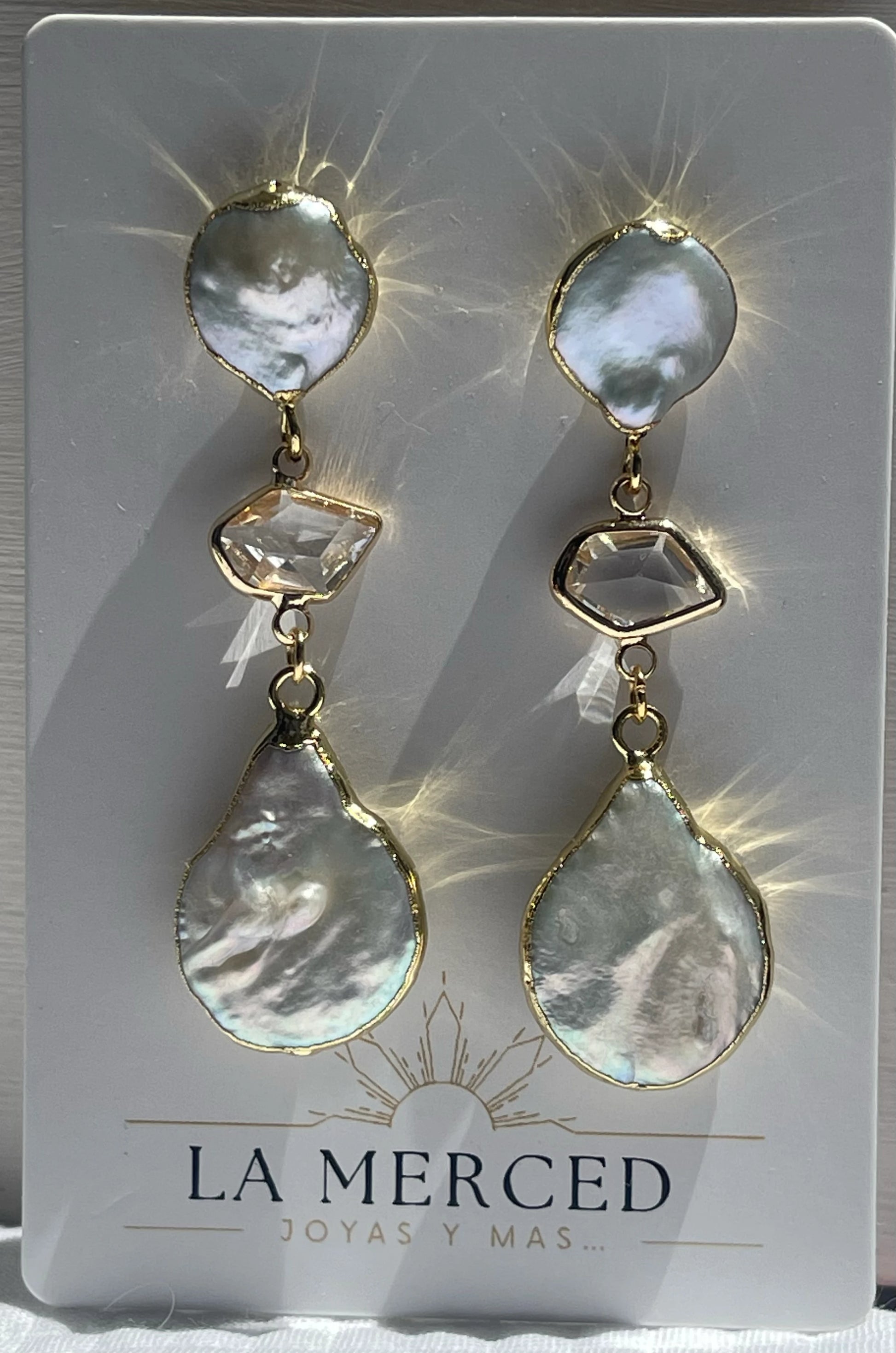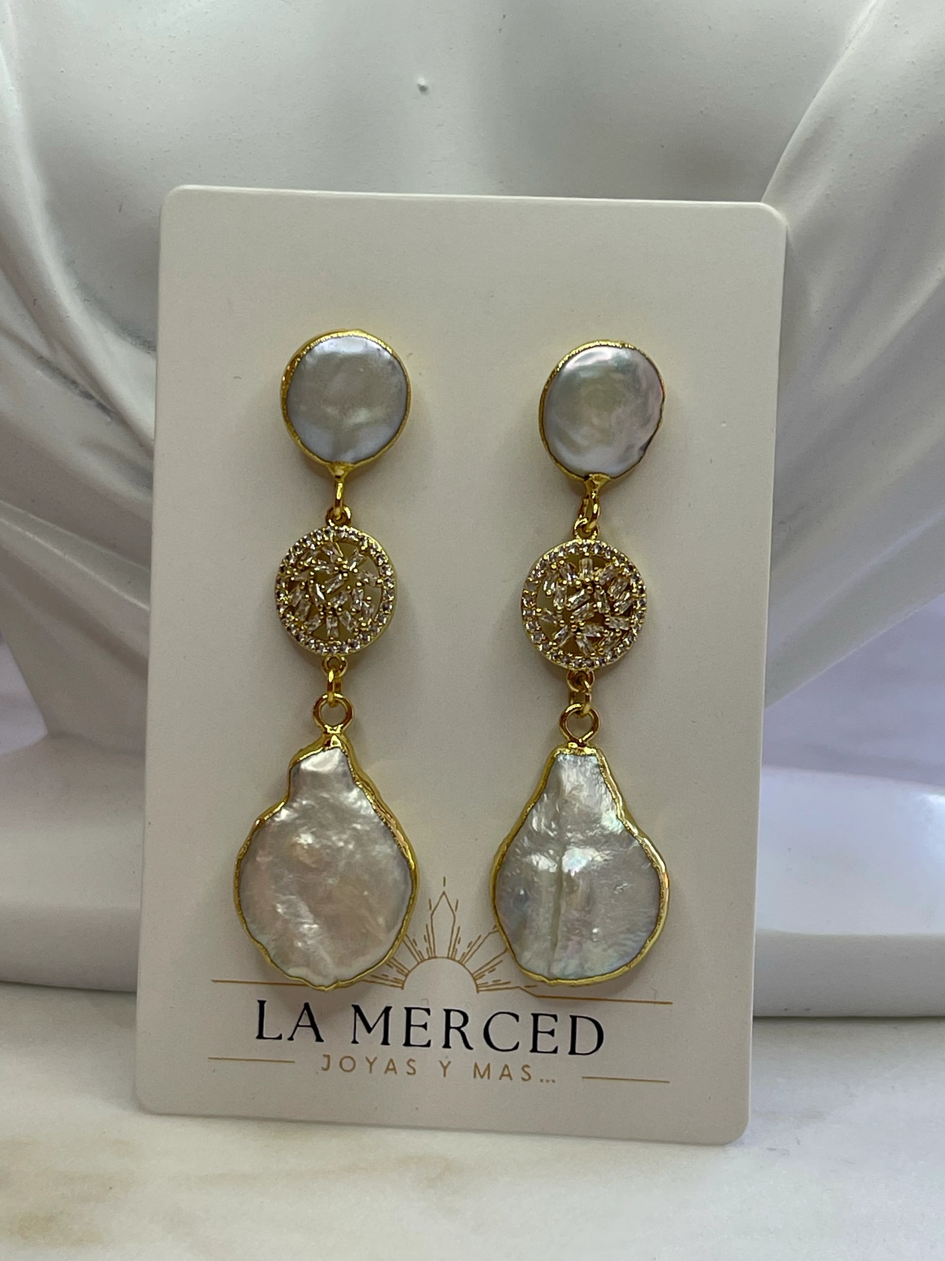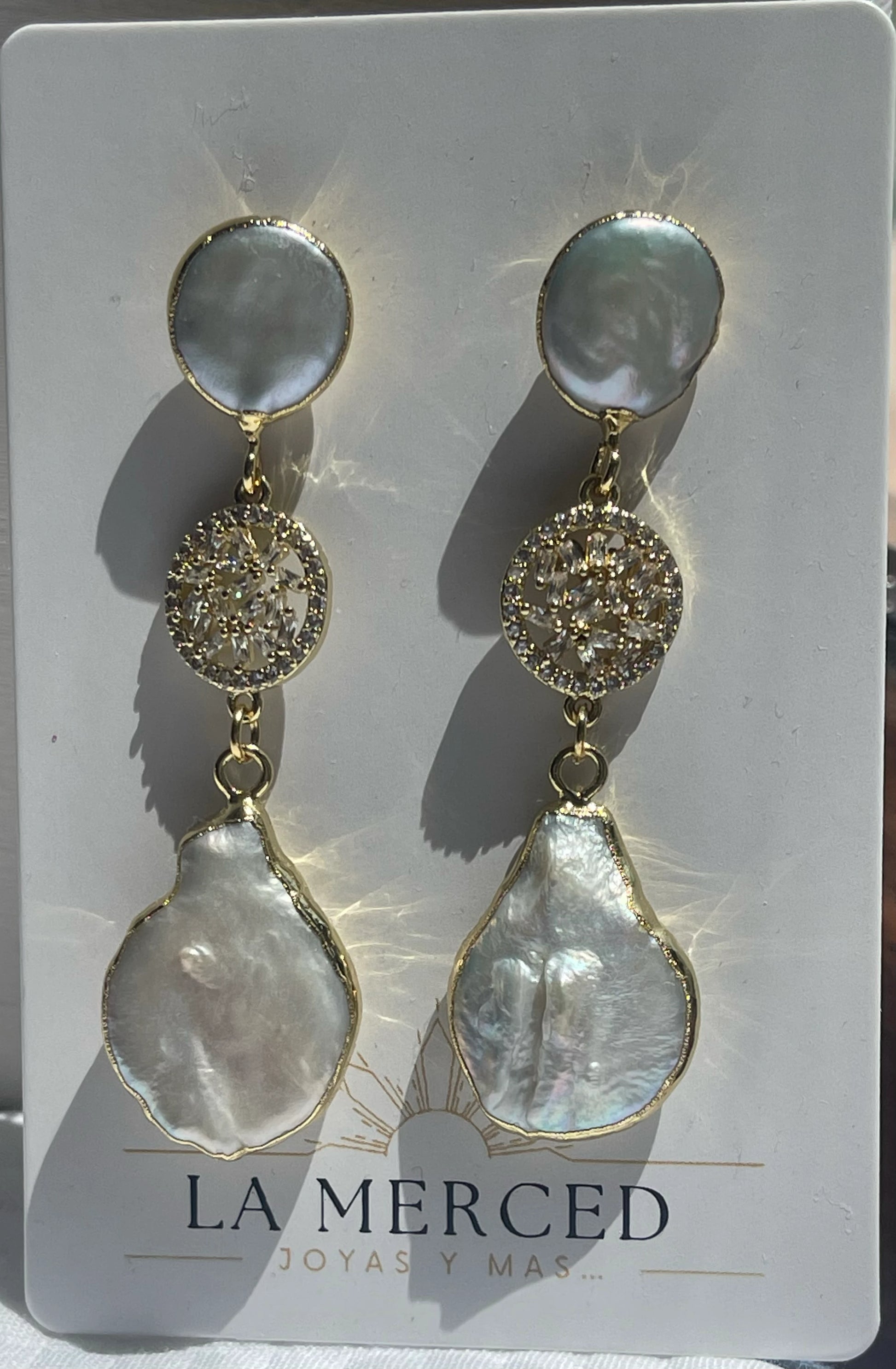 Los aros de perla barroca de La Merced son el equilibrio perfecto entre lujo artesanal y versatilidad. Su diseño único combina una base de perla barroca natural, un colgante central a elección entre un círculo de circonitas brillantes o un cristal austriaco asimétrico, y un colgante final en forma de gota de perla barroca, todo cuidadosamente enchapado en oro de 18 quilates.