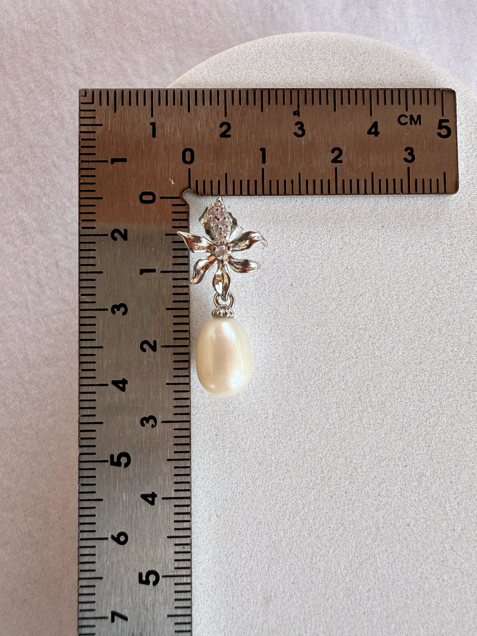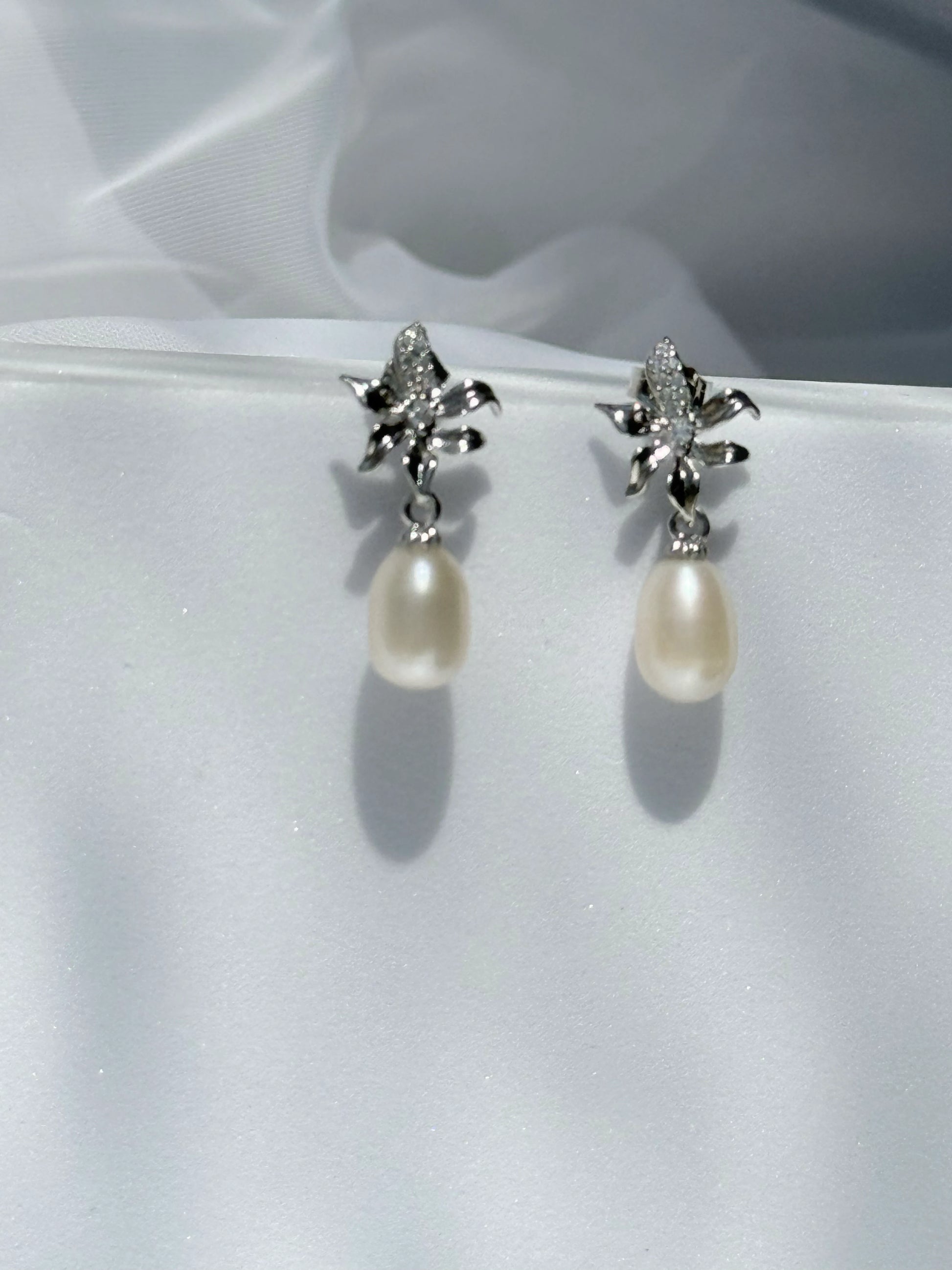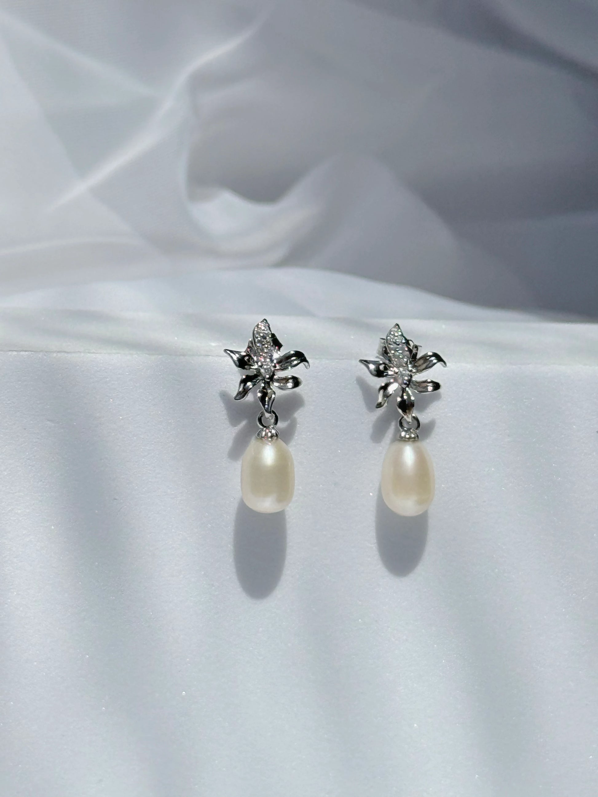 Los Aros de Perla Natural - Bloom Pearl celebran la belleza de la naturaleza con un diseño que combina la delicadeza de una flor y la pureza de la perla. Su base con forma de flor está cuidadosamente adornada con circonitas talladas, que aportan destellos sutiles y reflejos de luz desde cada pétalo. Desde ella, desciende una perla natural tipo gota, símbolo de feminidad, calma y elegancia atemporal.