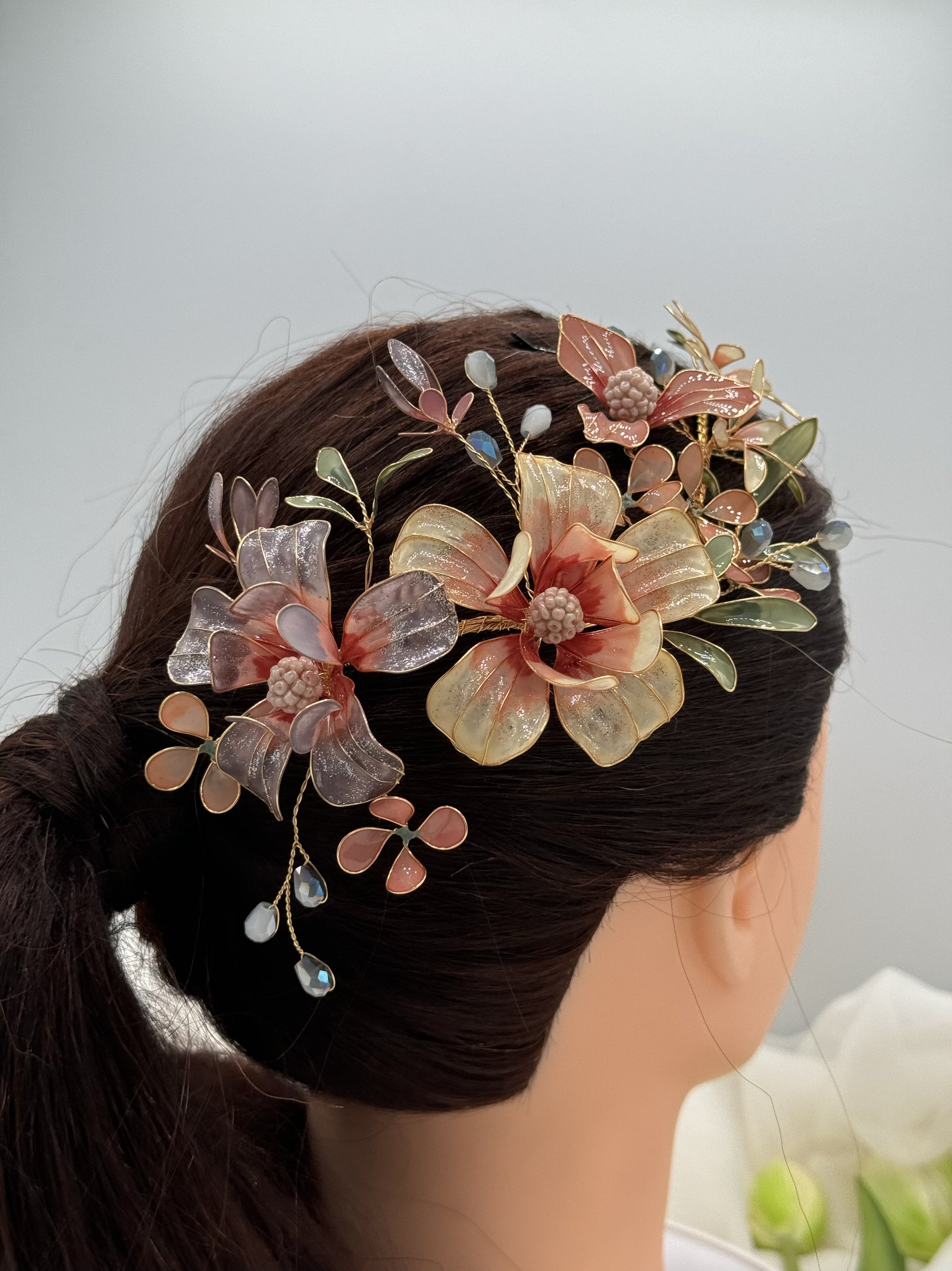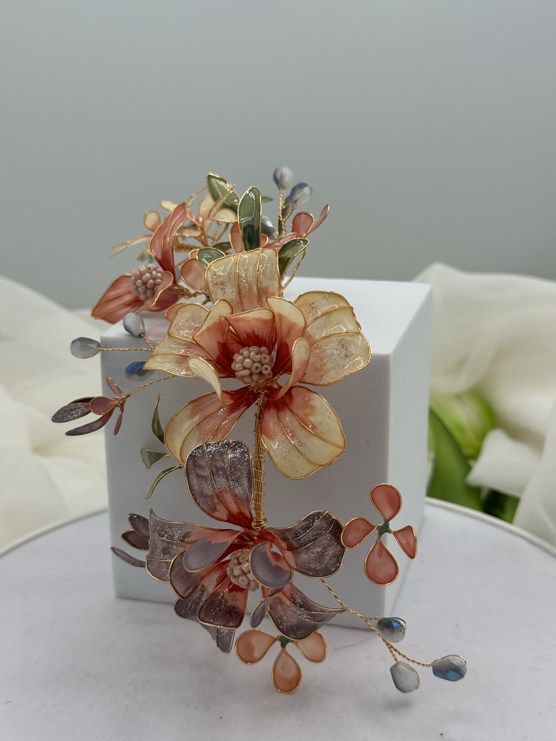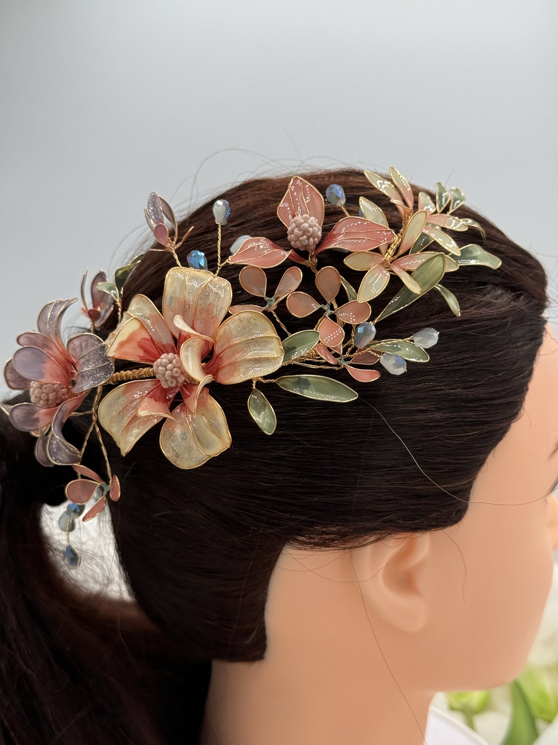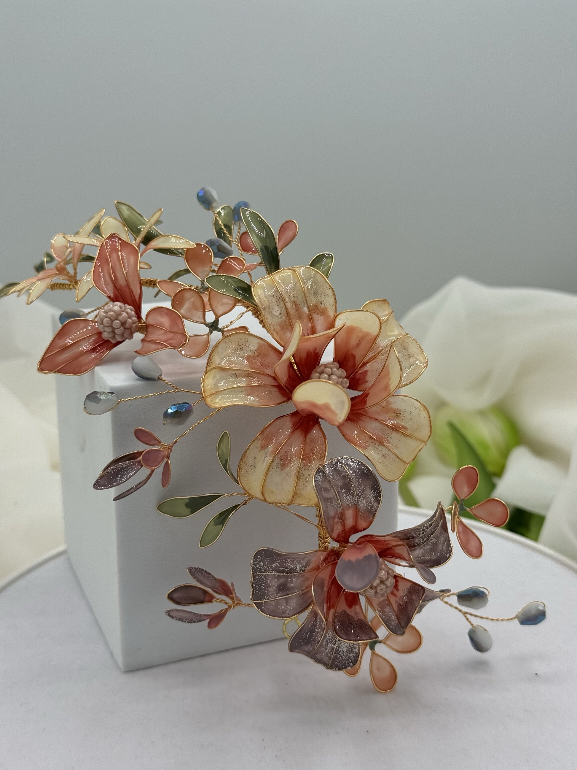 Elaborado con la delicada técnica de flores de cristal, combina tonos coral, champagne y verde oliva en una composición vibrante y elegante. Cada pétalo ha sido modelado a mano, logrando reflejos suaves y destellos dorados que iluminan el peinado con un brillo natural.